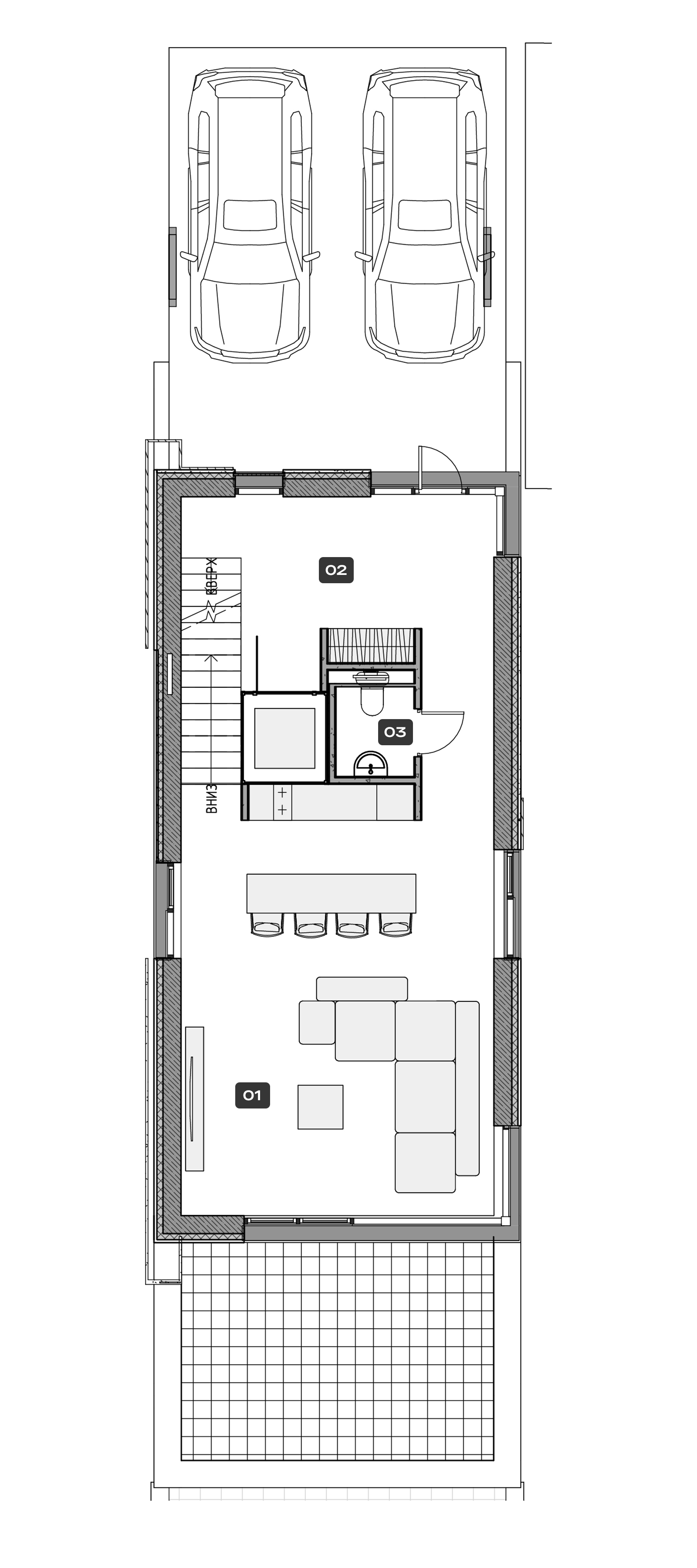 Из-за перепада высот цокольный этаж с сауной и комнатой отдыха имеет прямой выход через панорамные окна на пляж. Главный вход находится на втором этаже, где расположена кухня-гостиная. Все этажи связывает стеклянный лифт. Фасад обшит фиброцементными панелями, а в зоне благоустройства мы использовали бетон и дерево, разместив там бассейн, беседку и мангальную зону. Объект получился очень атмосферным благодаря непосредственной близости к воде и продуманной планировке.
