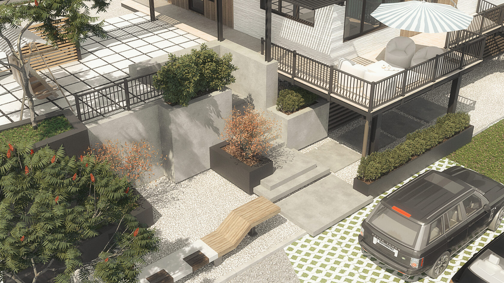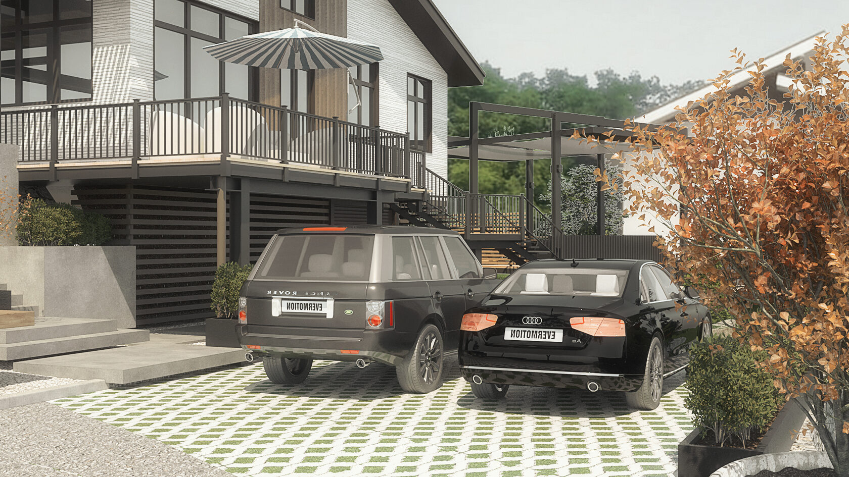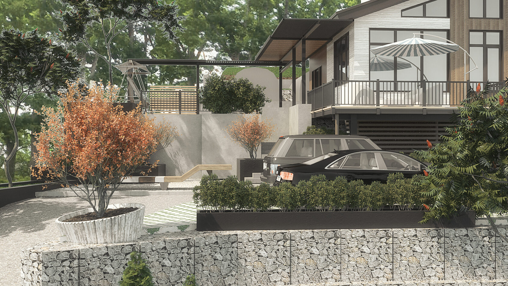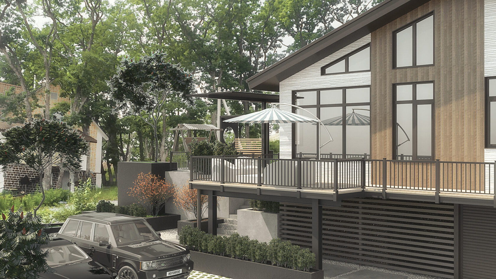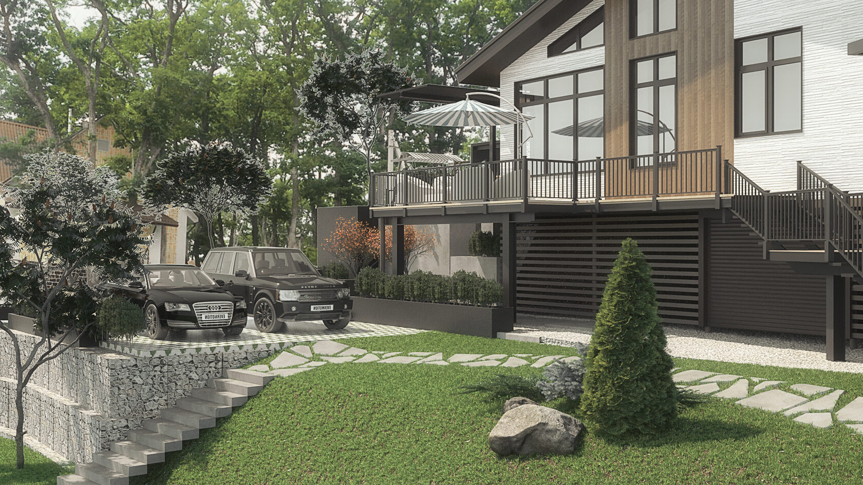 На верхнем уровне, у выхода из дома, мы организовали просторную террасу и зону отдыха с барбекю. Ниже, на уровне цоколя, который мы отделали деревянными рейками, разместили парковку, вторую зону отдыха, клумбы и лавочки. Уровни соединили деревянными и капитальными бетонными лестницами. Дорожки из камня и парящие бетонные площадки гармонично сочетаются с деревянными конструкциями, реечными стенами и заборчиками. В итоге мы получили единое пространство в эко-стиле, где каждый уголок участка теперь полезен и красив.