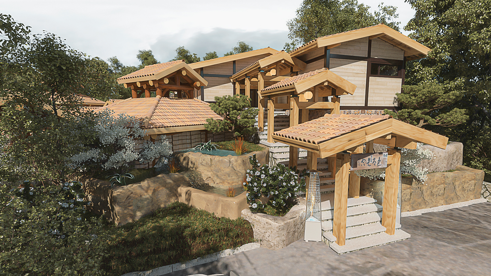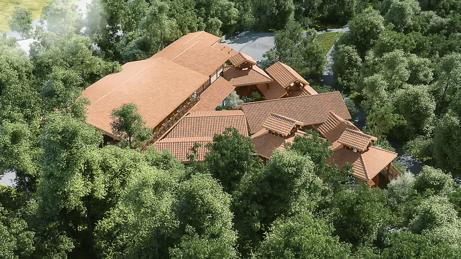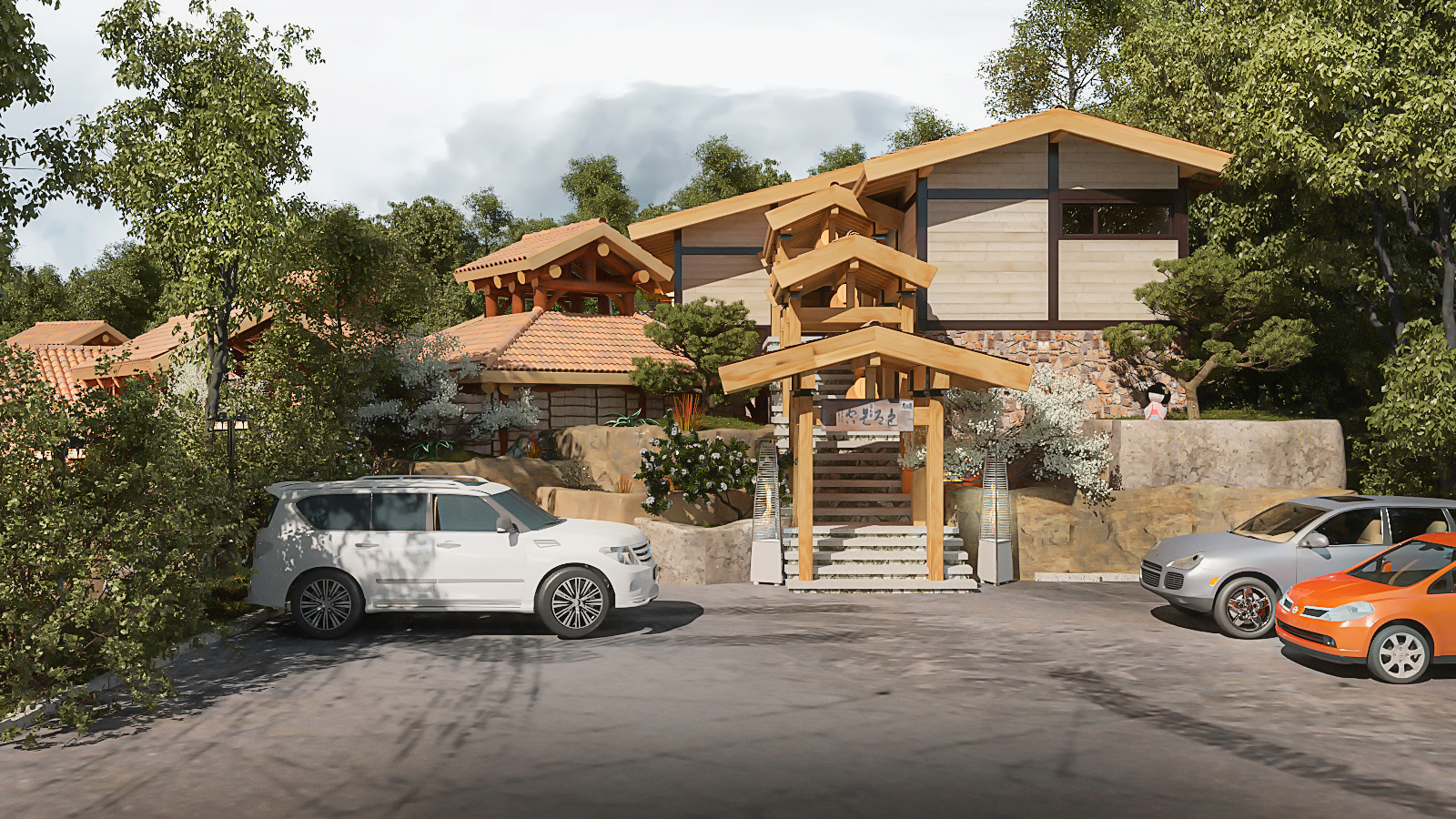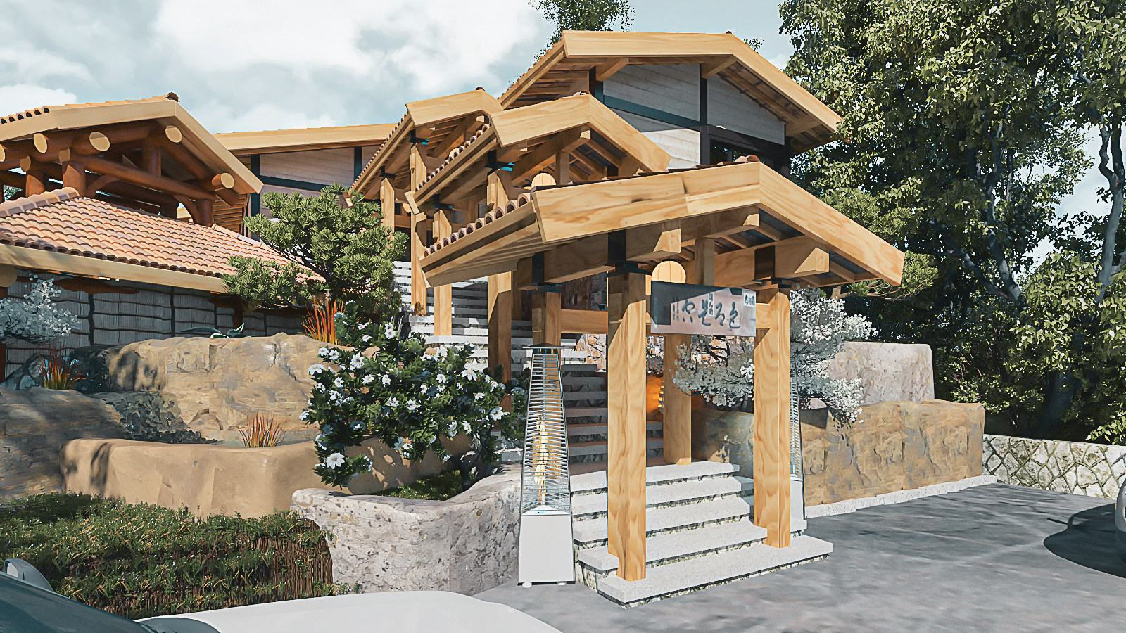 Архитектура выдержана в традиционном японском стиле с характерными кровлями, обширным использованием дерева в отделке и гармоничным соединением интерьеров с окружающим ландшафтом через систему крытых террас. Проектом также предусмотрена парковочная зона.