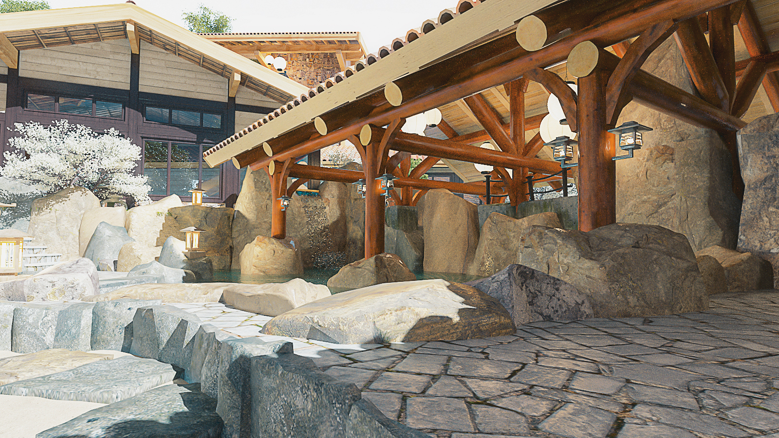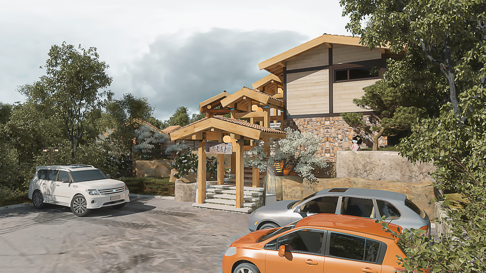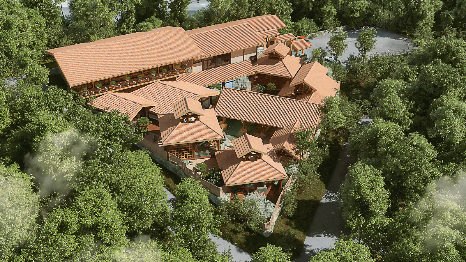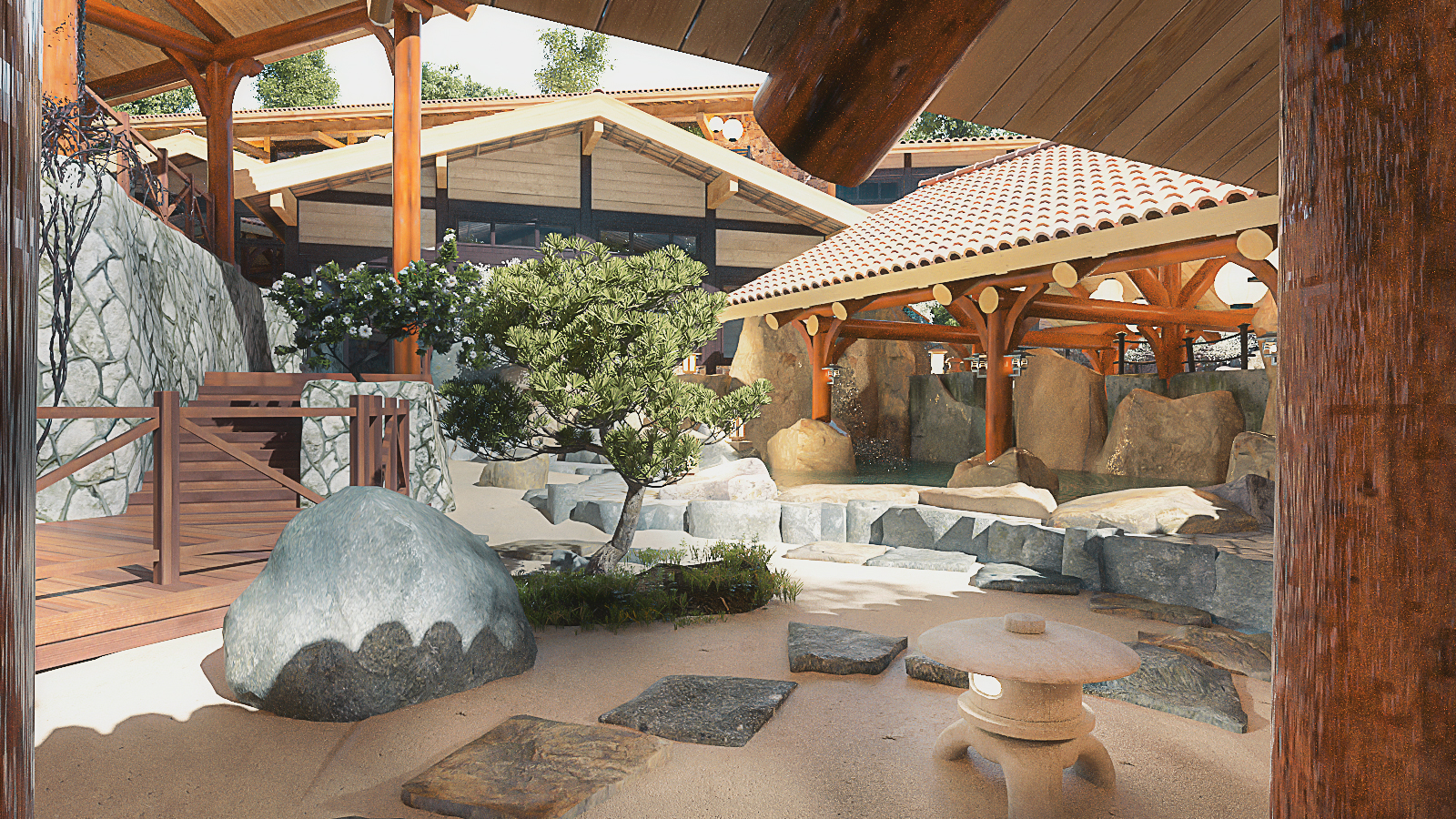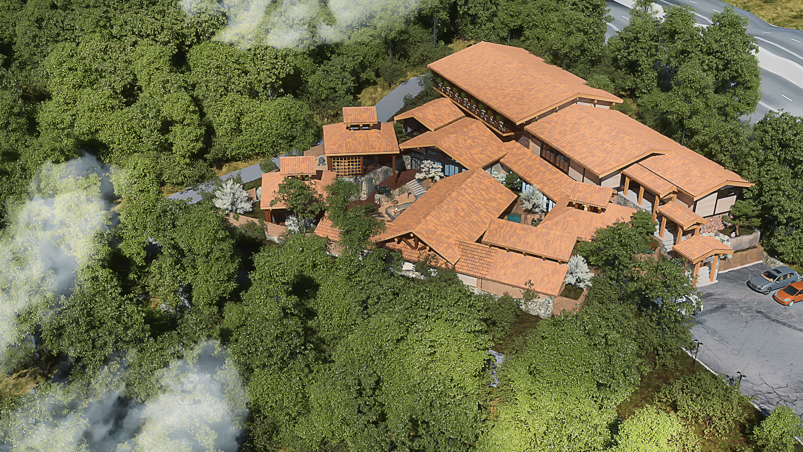 Архитектура выдержана в традиционном японском стиле с характерными кровлями, обширным использованием дерева в отделке и гармоничным соединением интерьеров с окружающим ландшафтом через систему крытых террас. Проектом также предусмотрена парковочная зона.