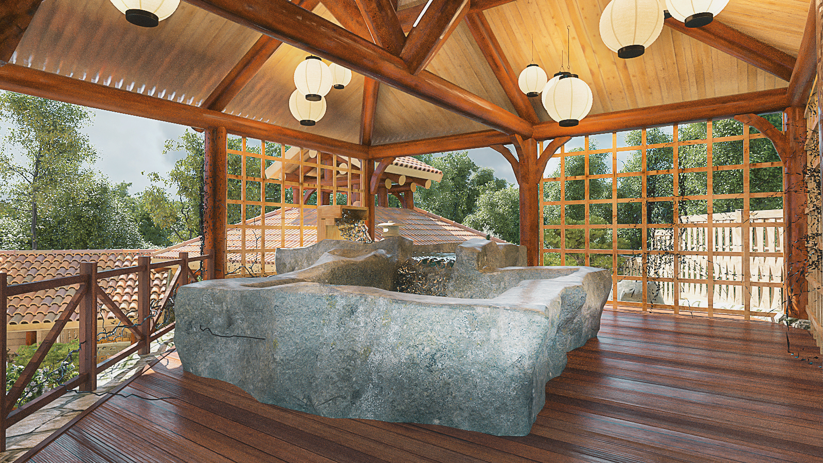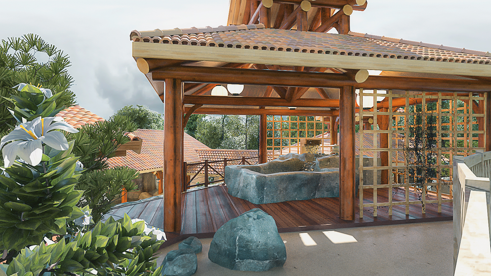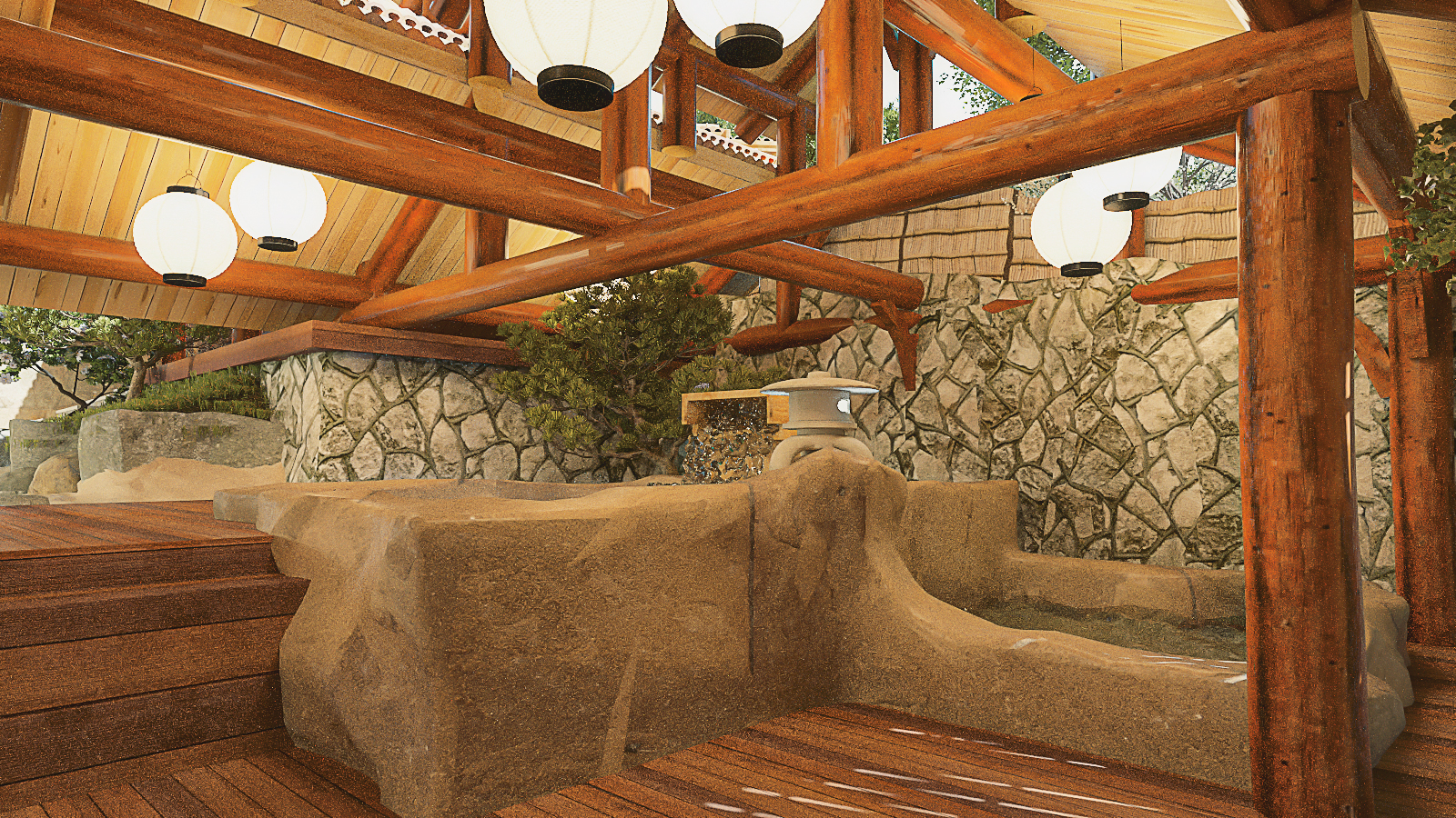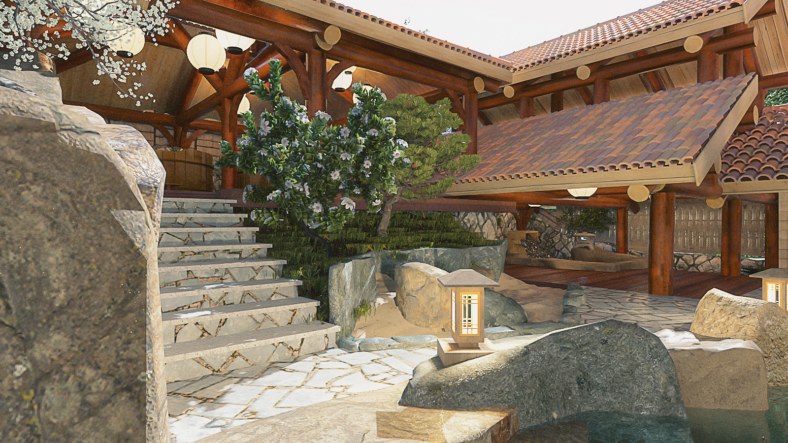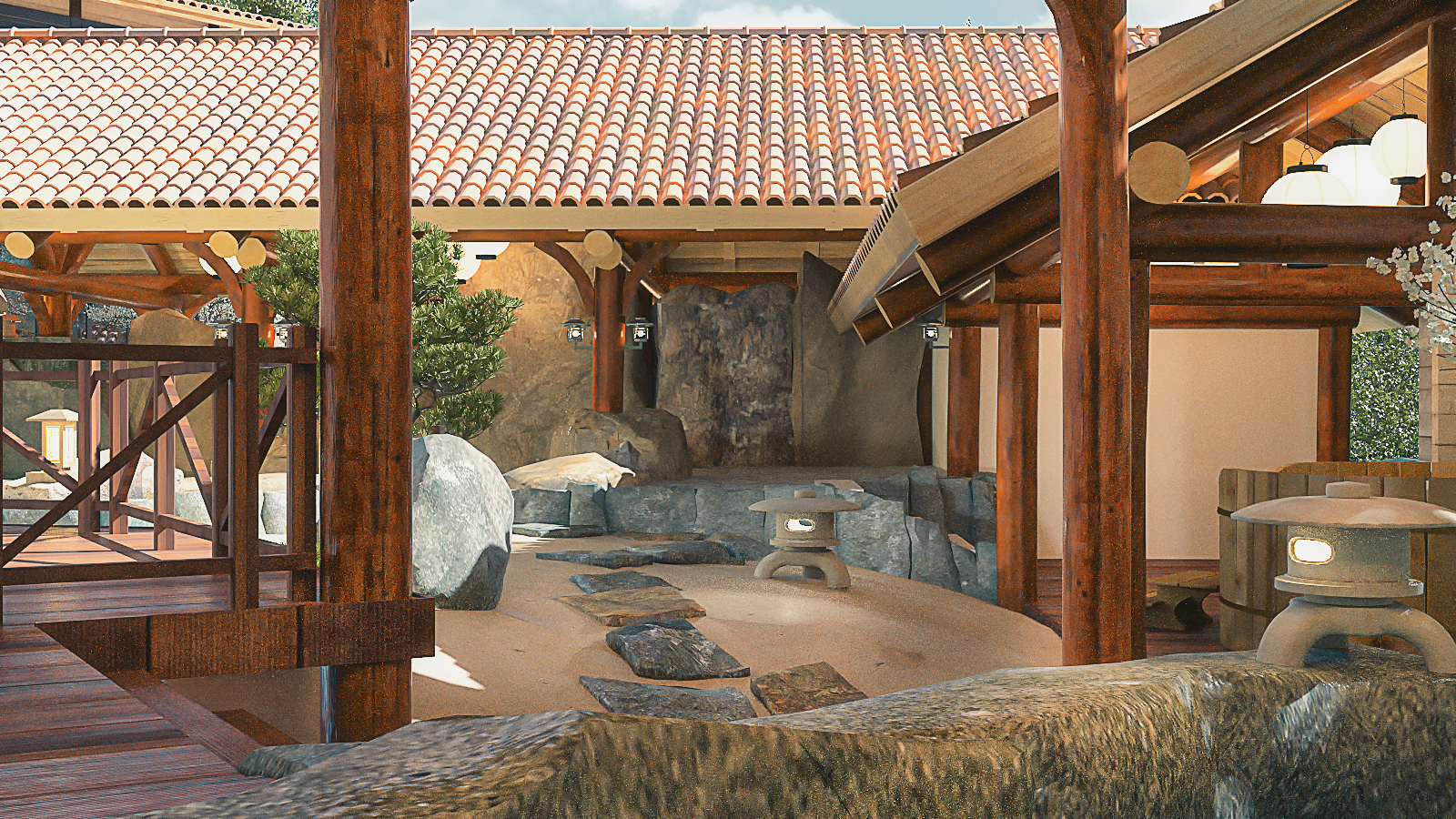 Мы спроектировали банный комплекс в японском стиле как целостный архитектурный ансамбль. Двухэтажное здание с крытыми верандами и террасами органично вписано в рельеф участка с небольшим перепадом высот.