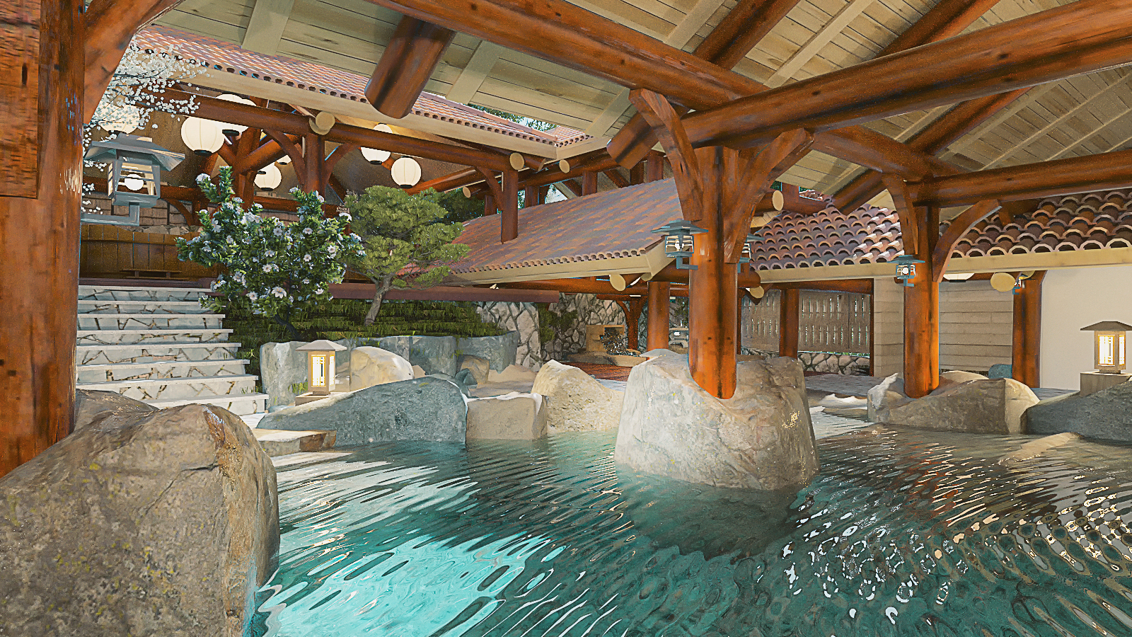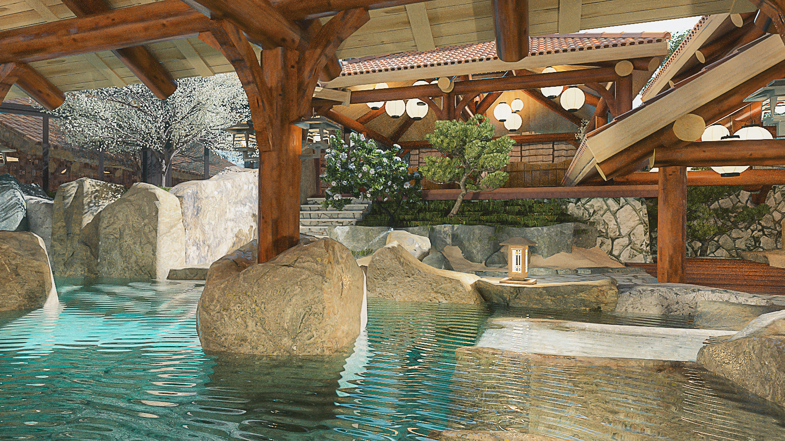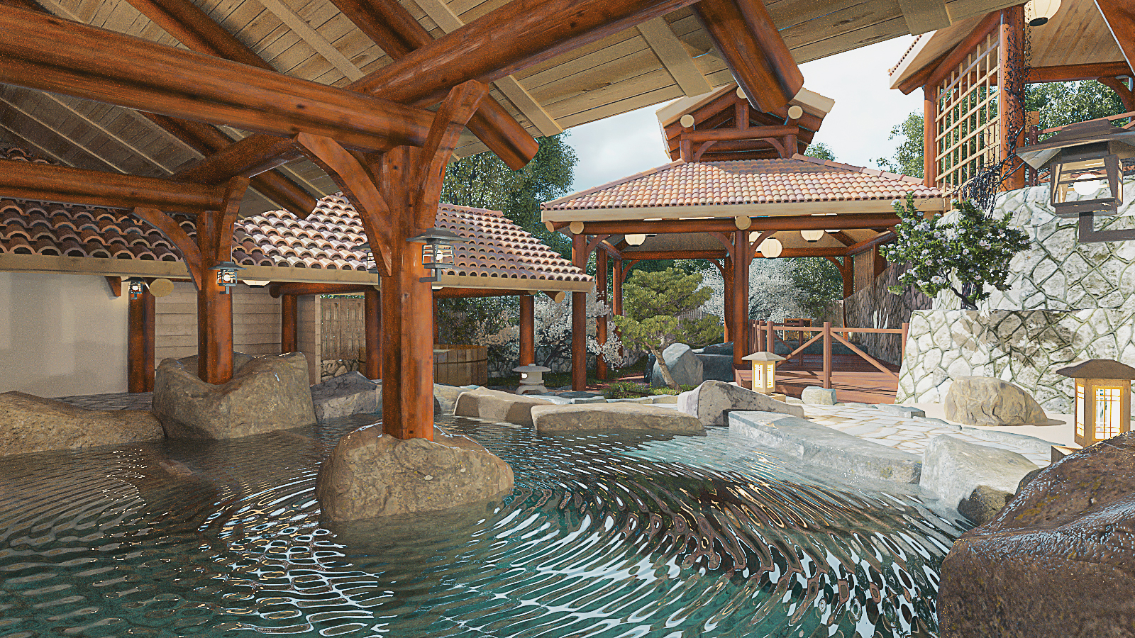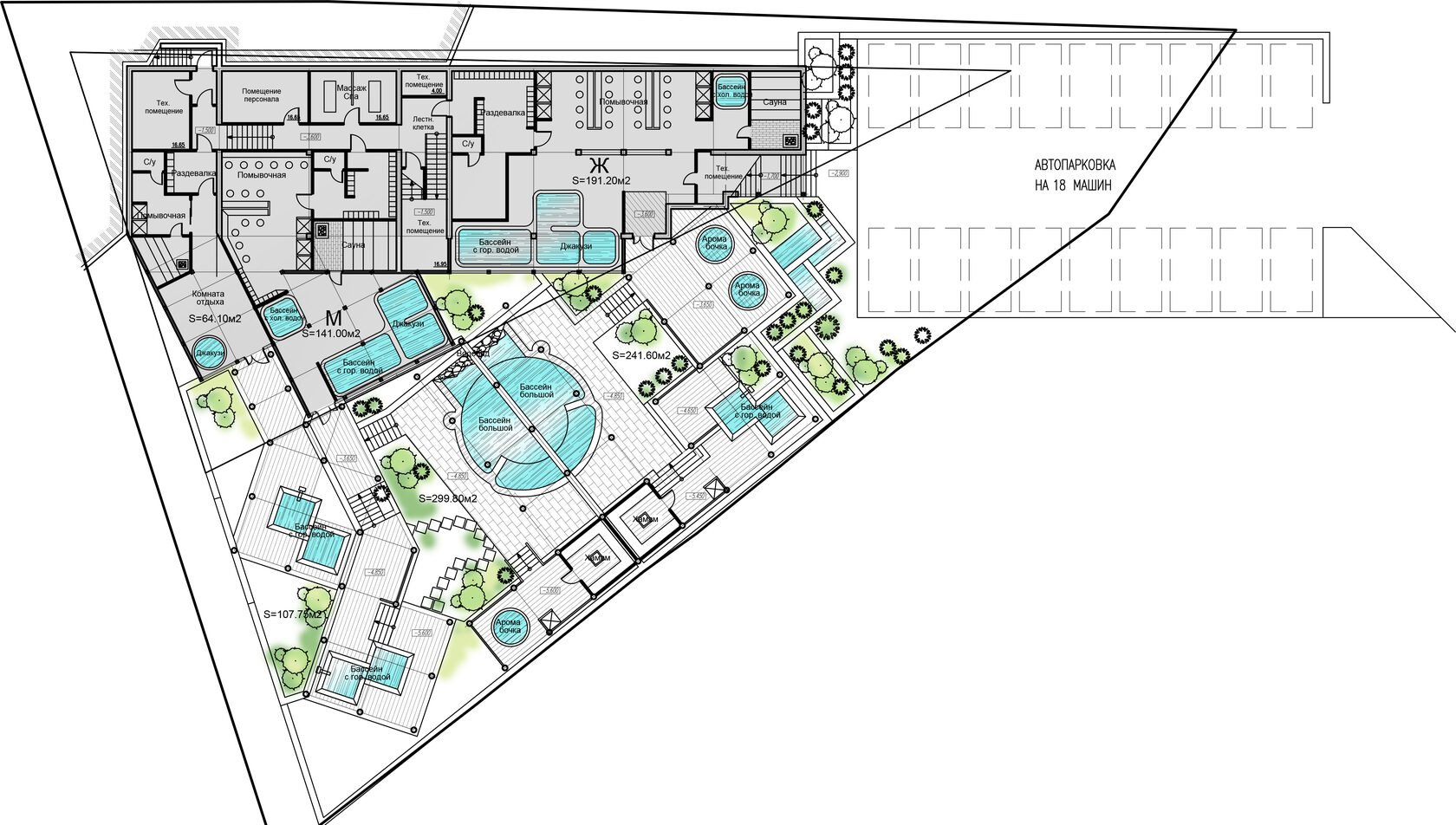 На первом этаже расположены раздельные мужское и женское отделения с бассейнами, саунами, хамамами и помывочными. Второй этаж отведен под общие зоны: кафе, бильярдную, парикмахерскую и барбершоп. Внешняя территория организована как многоуровневое пространство с бассейнами, аромабочками и зонами отдыха, соединенными сетью дорожек и лестниц.
