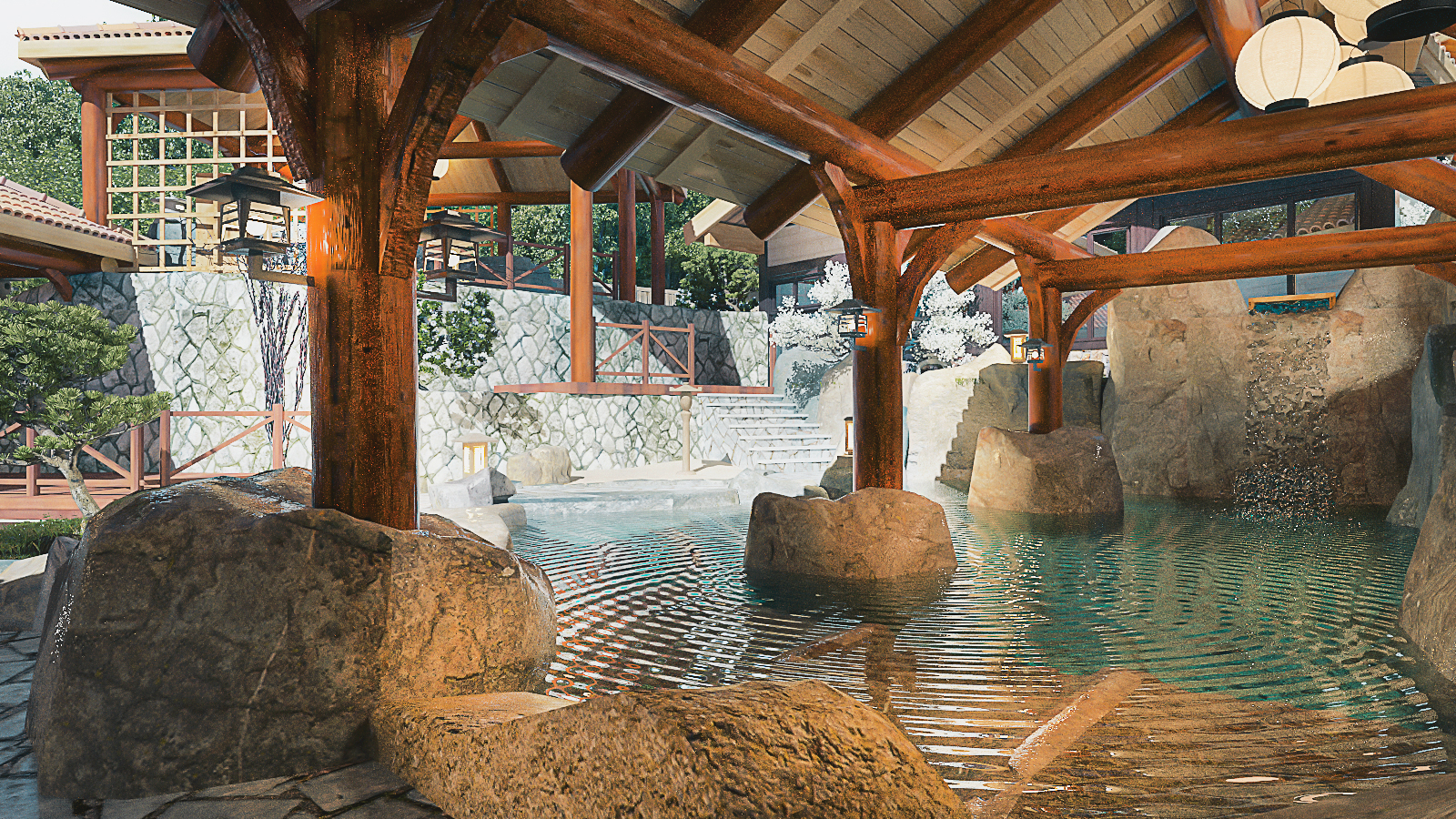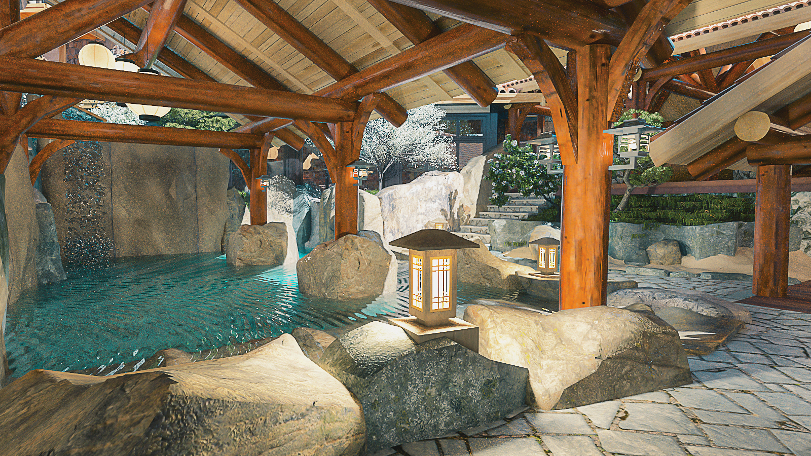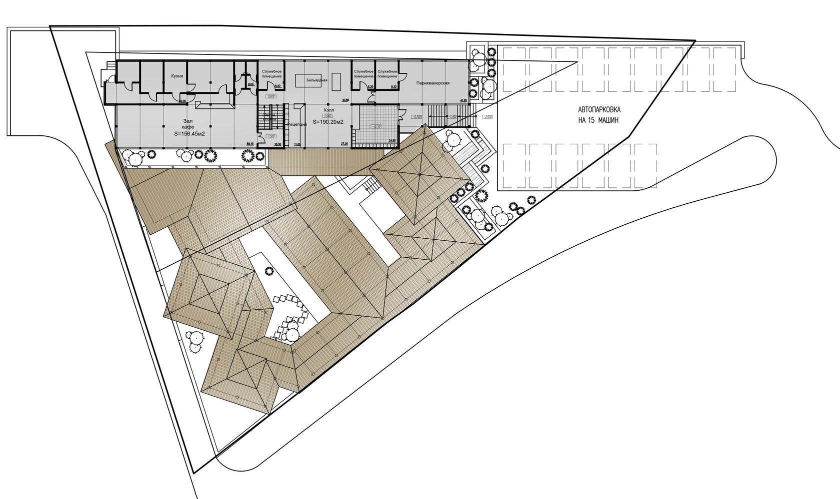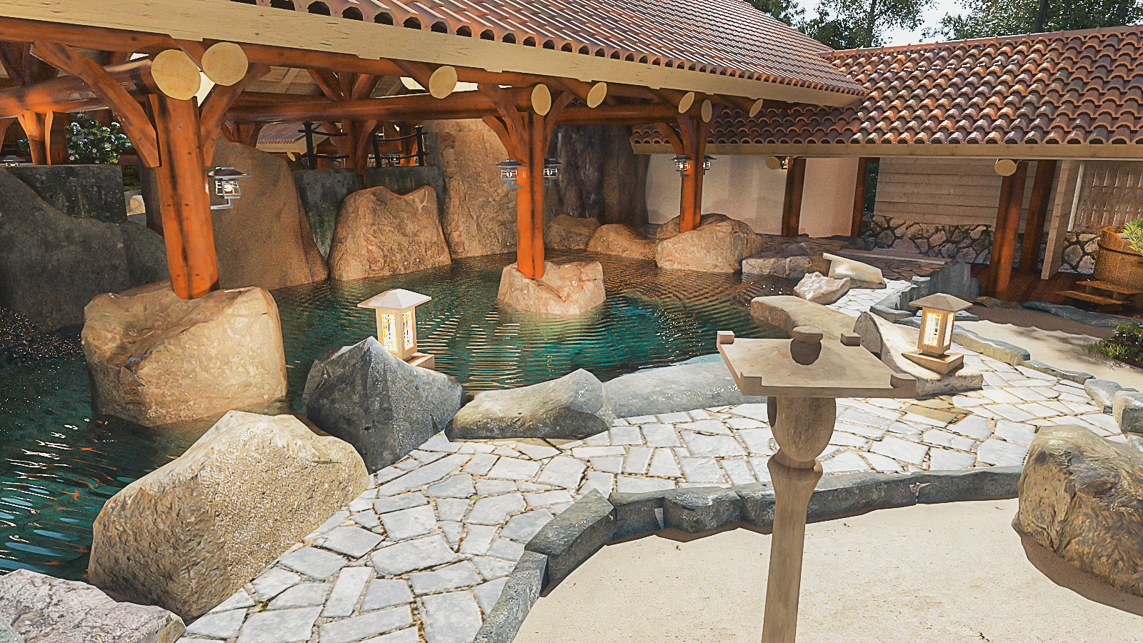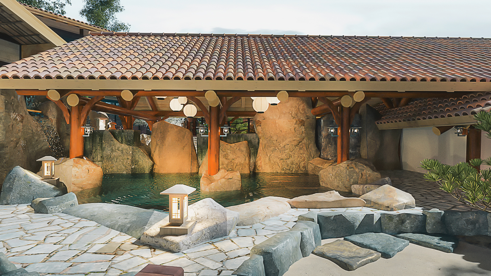 На первом этаже расположены раздельные мужское и женское отделения с бассейнами, саунами, хамамами и помывочными. Второй этаж отведен под общие зоны: кафе, бильярдную, парикмахерскую и барбершоп. Внешняя территория организована как многоуровневое пространство с бассейнами, аромабочками и зонами отдыха, соединенными сетью дорожек и лестниц.
