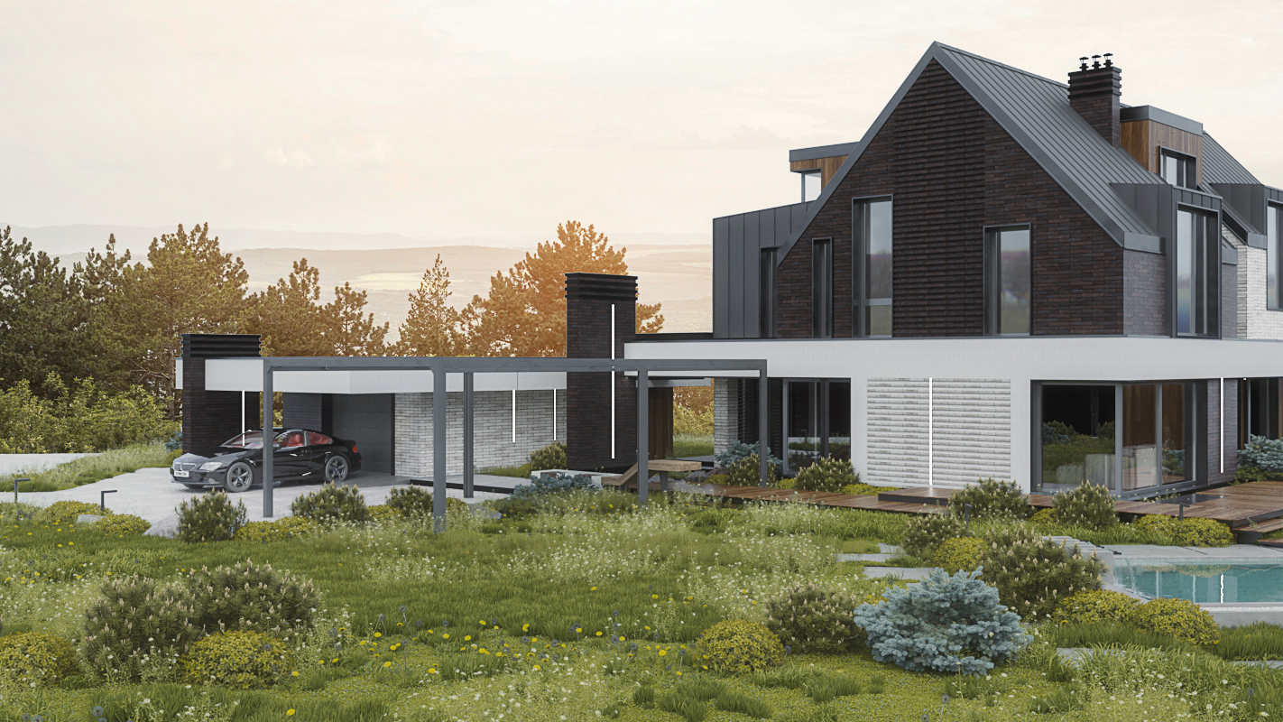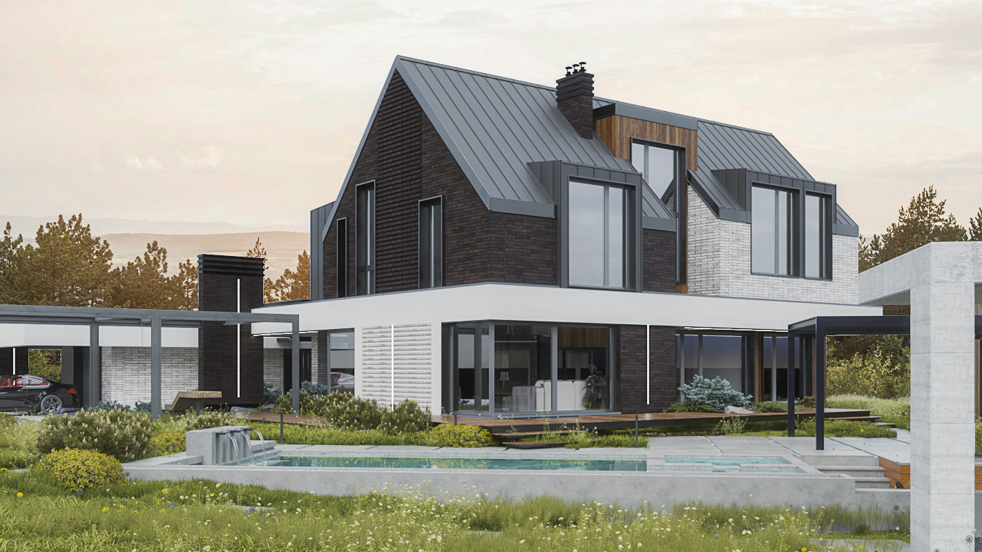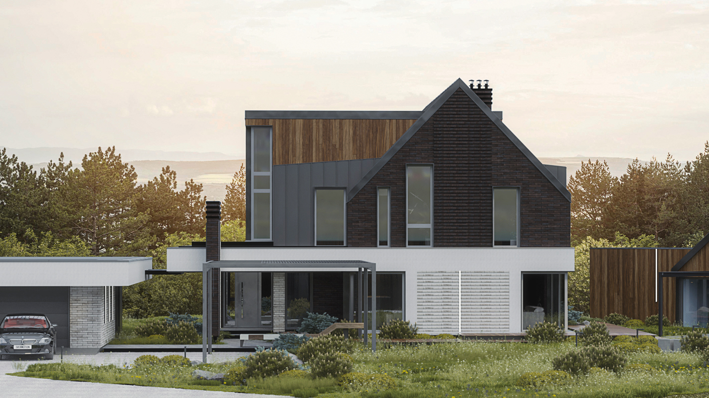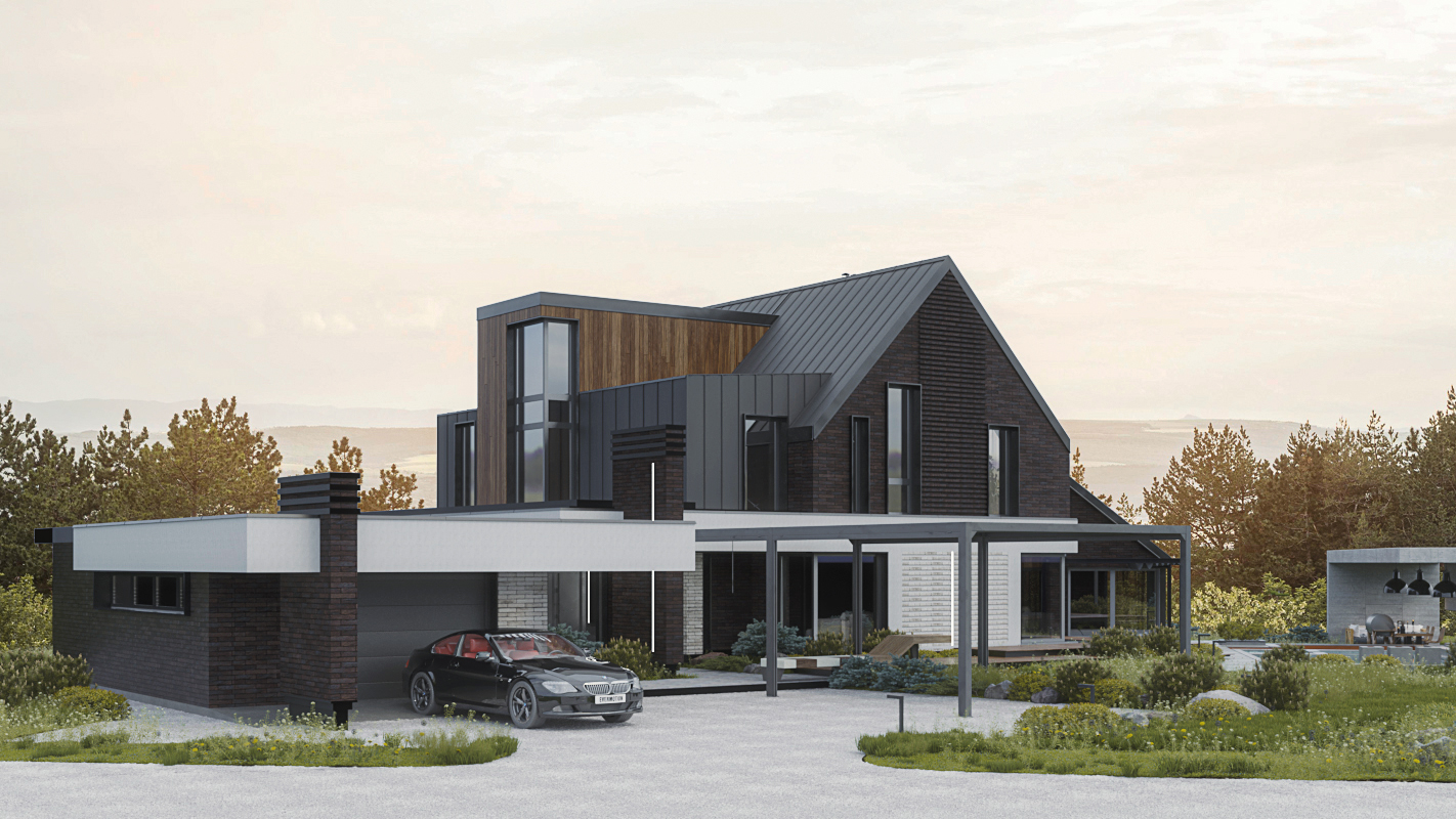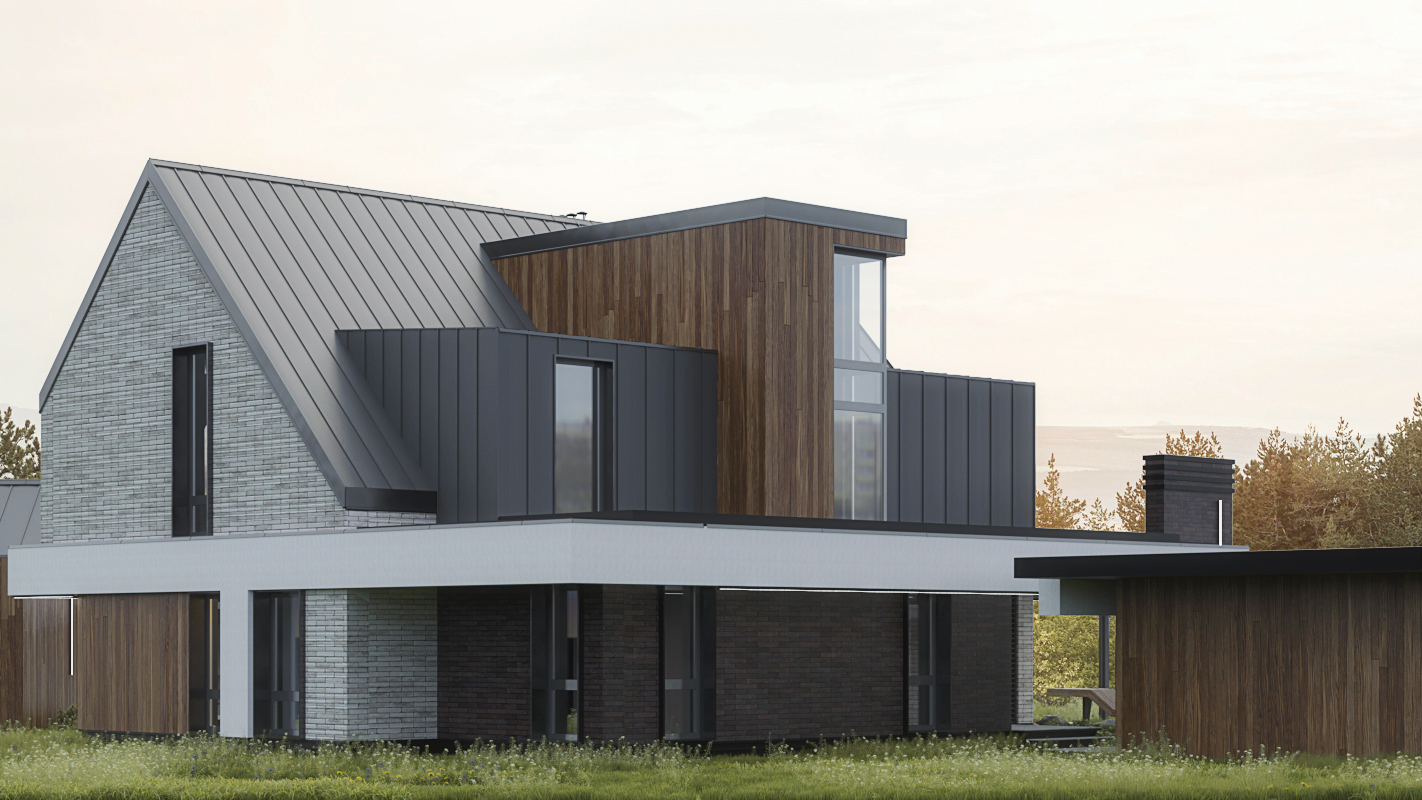 Мы спроектировали двухэтажный дом в скандинавском стиле. Хотя второй этаж мансардный, мы сделали его полным света. Для этого подняли часть стен выше линии кровли, создав световые фронтоны под панорамные окна. Это решение сформировало сложную асимметричную кровлю, которая придала дому современный и динамичный облик. Фасад облицован деревом, фальцем и фиброцементными панелями, а угловые окна в нескольких местах стирают границу между внутренним пространством и участком.
