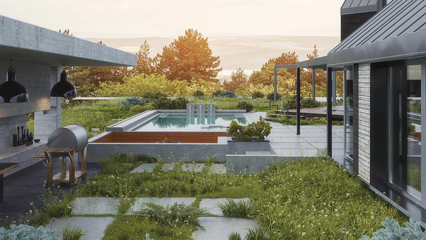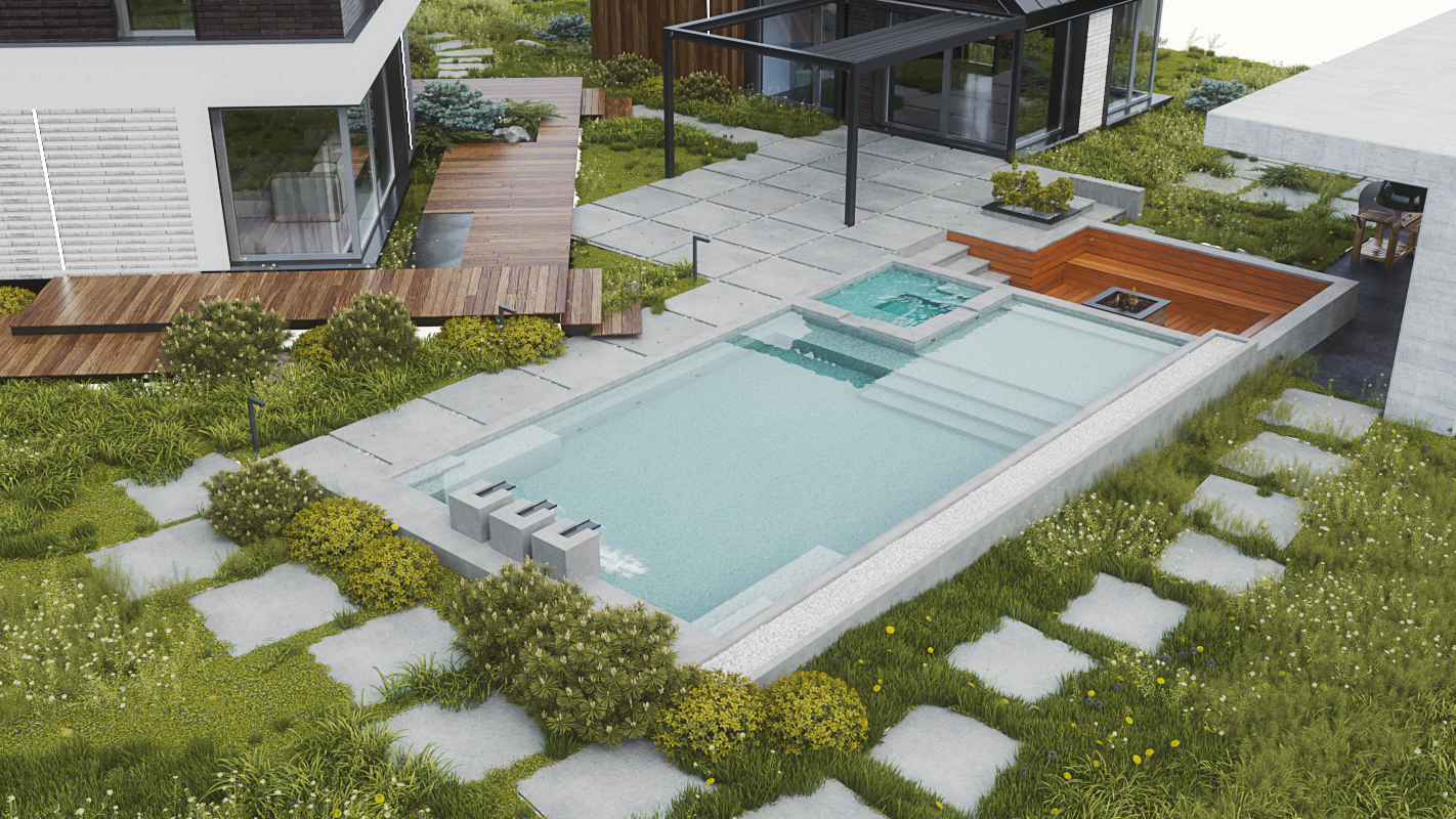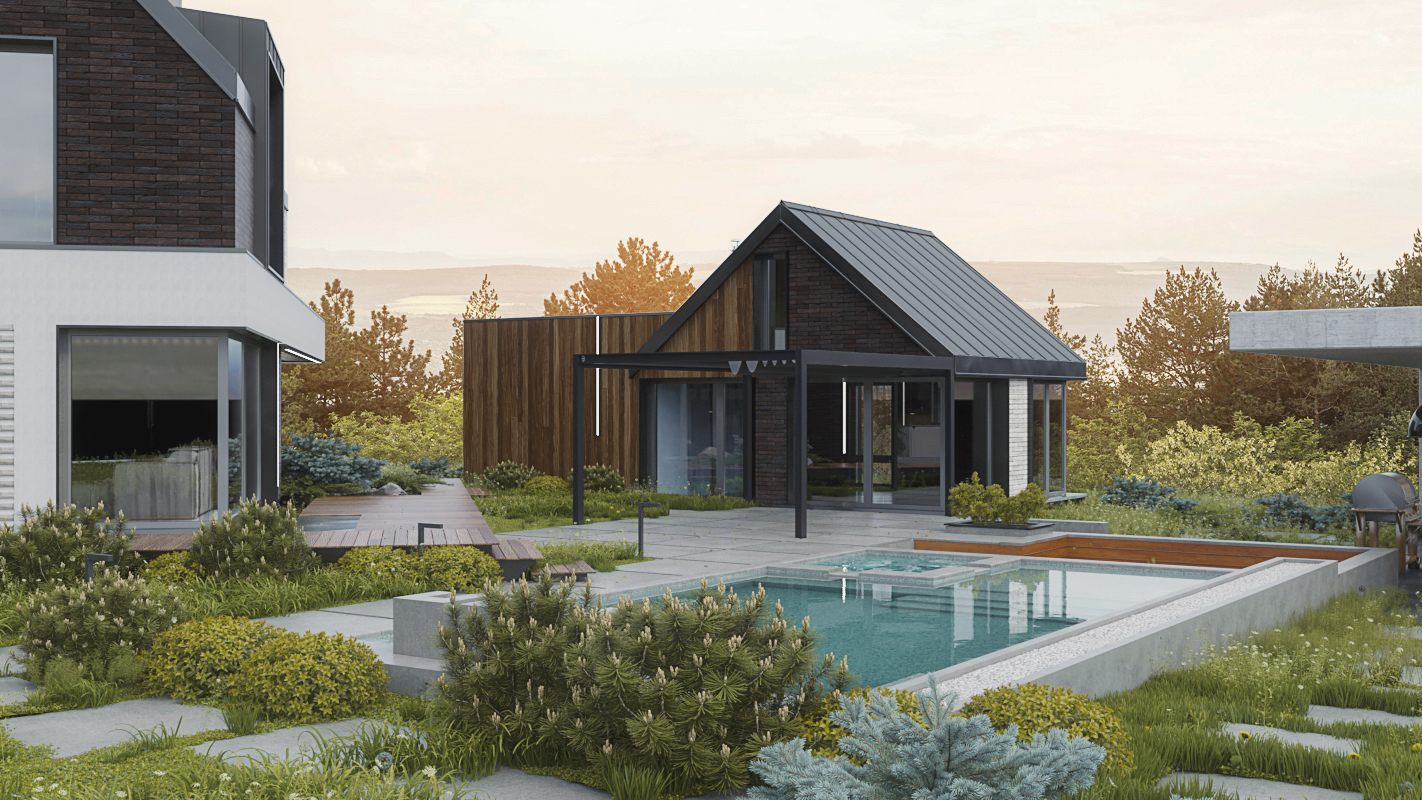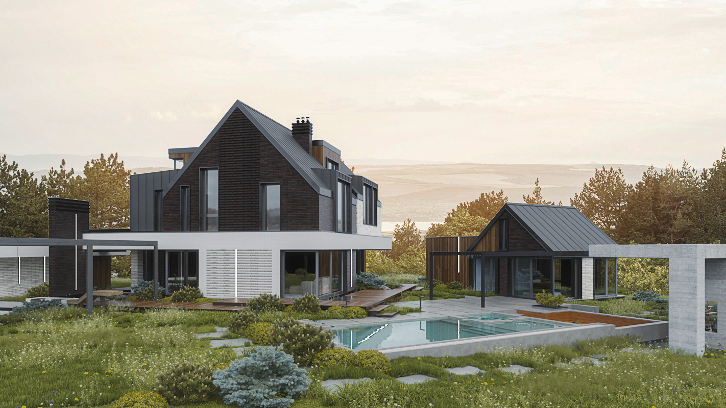 Планировка четко разделена: на первом этаже — изолированные гостиная, кухня-столовая, гостевая спальня и санузел. На втором этаже, освещенном вторым светом, находится мастер-спальня с собственной ванной и две детские с отдельным санузлом. Баня и бассейн объединены в одно пространство и связаны дорожками с домом и зоной барбекю. Рядом с домом обустроили деревянную террасу и площадку для отдыха.