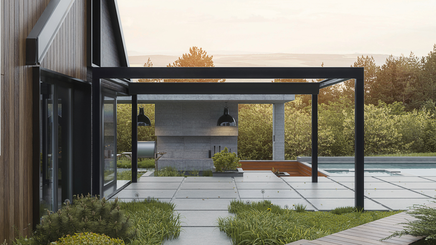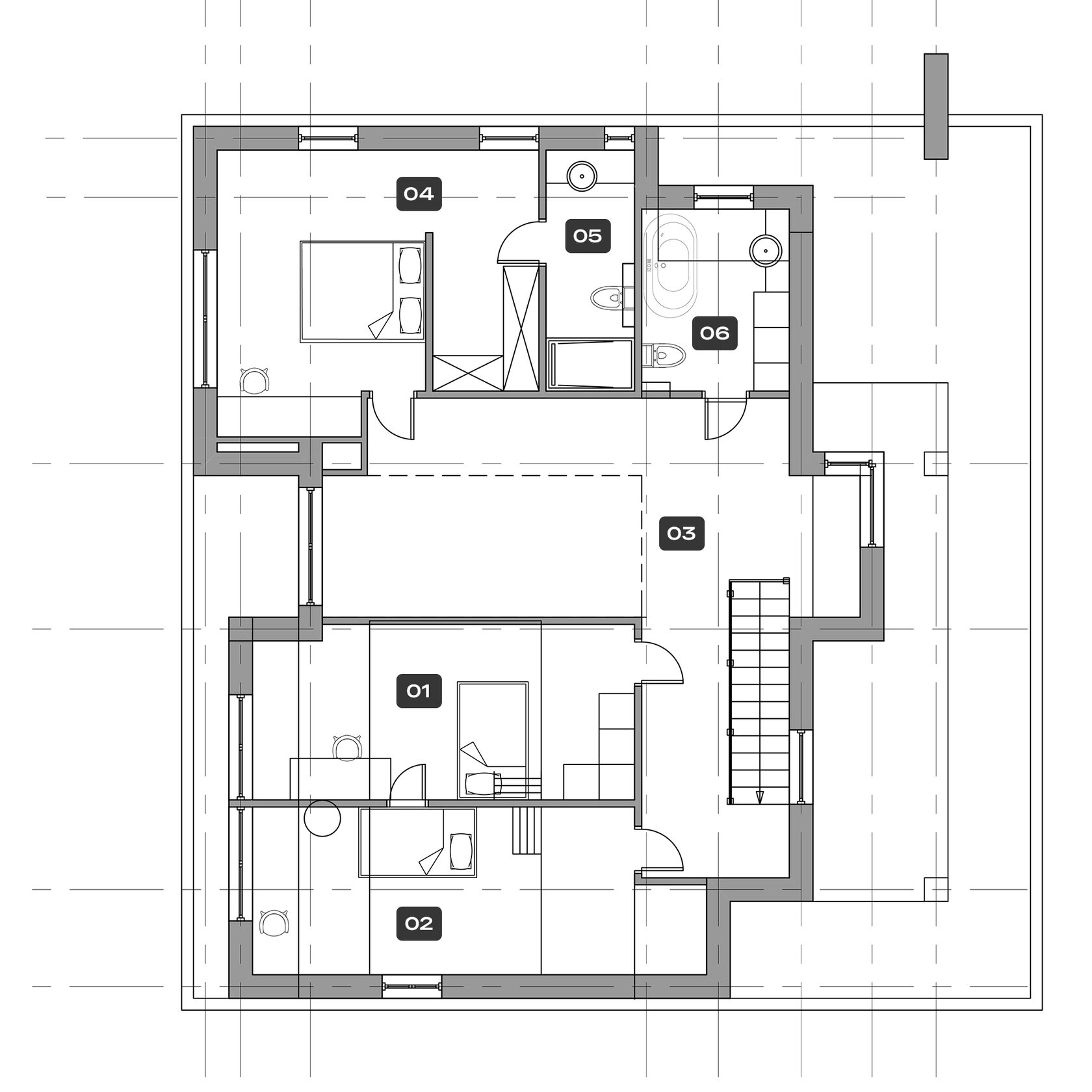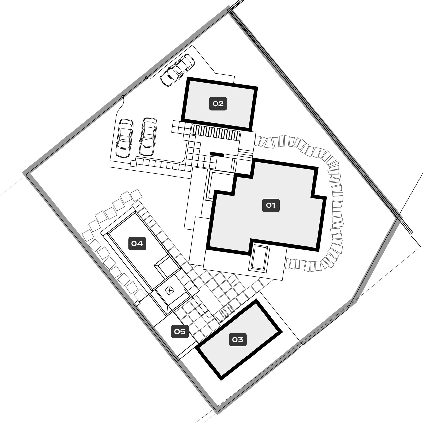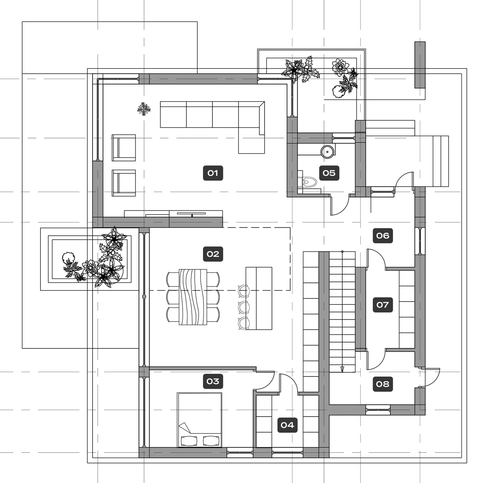 Планировка четко разделена: на первом этаже — изолированные гостиная, кухня-столовая, гостевая спальня и санузел. На втором этаже, освещенном вторым светом, находится мастер-спальня с собственной ванной и две детские с отдельным санузлом. Баня и бассейн объединены в одно пространство и связаны дорожками с домом и зоной барбекю. Рядом с домом обустроили деревянную террасу и площадку для отдыха.