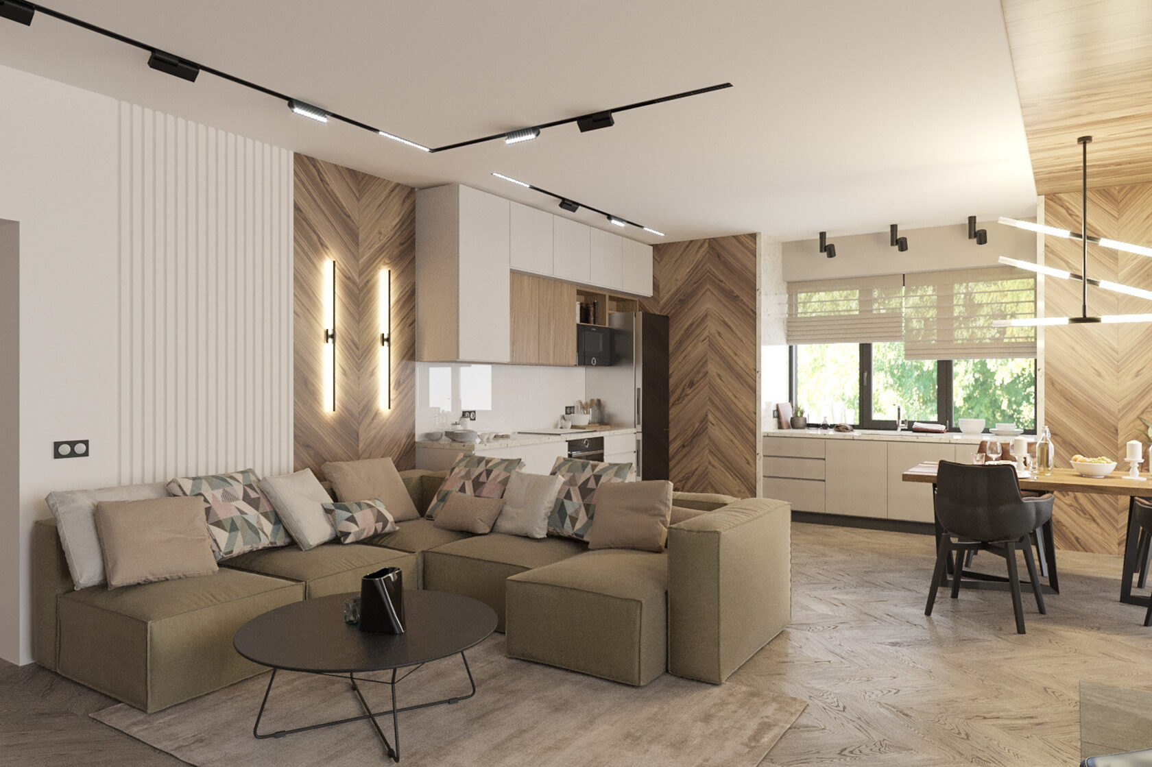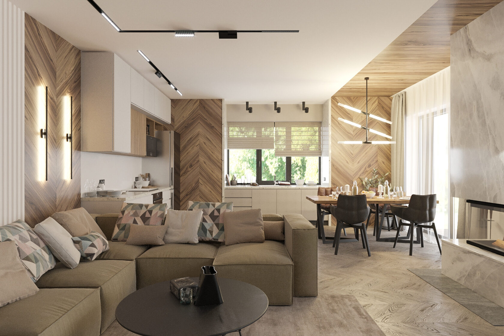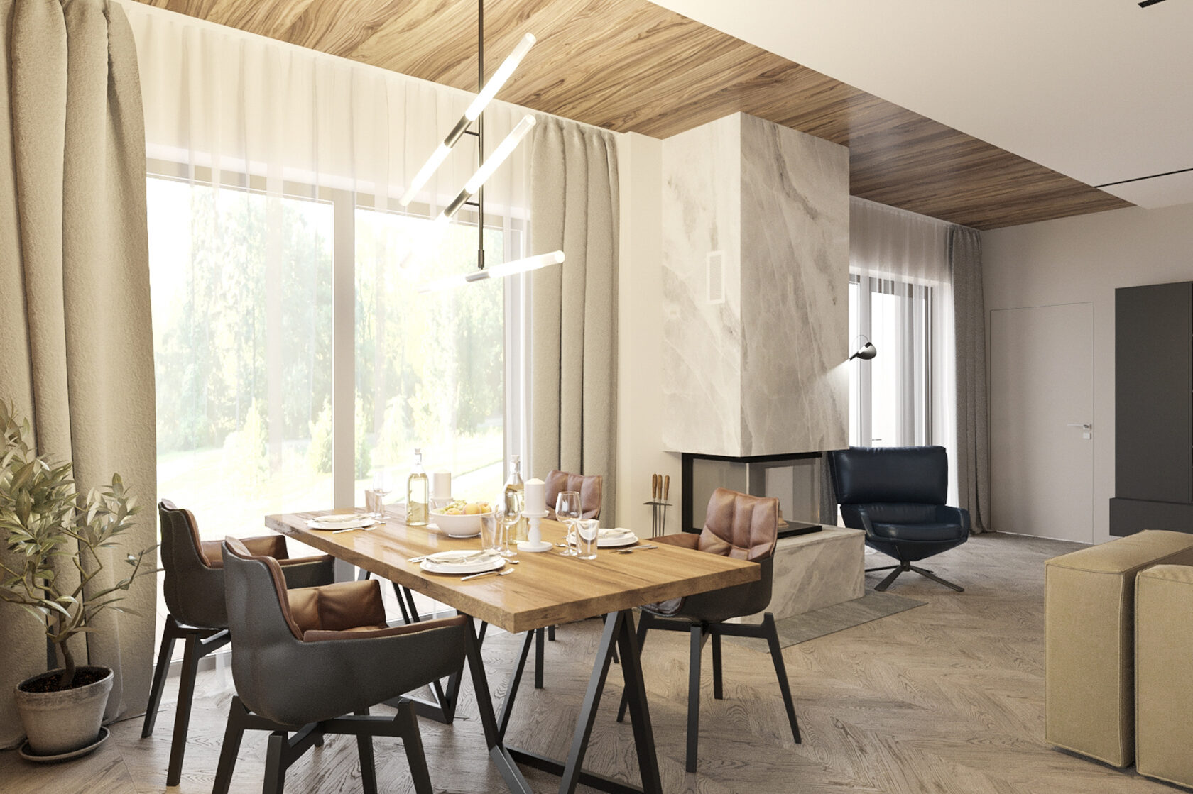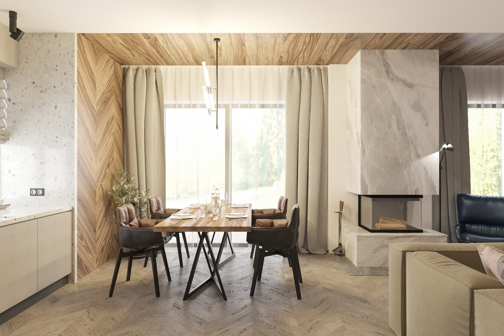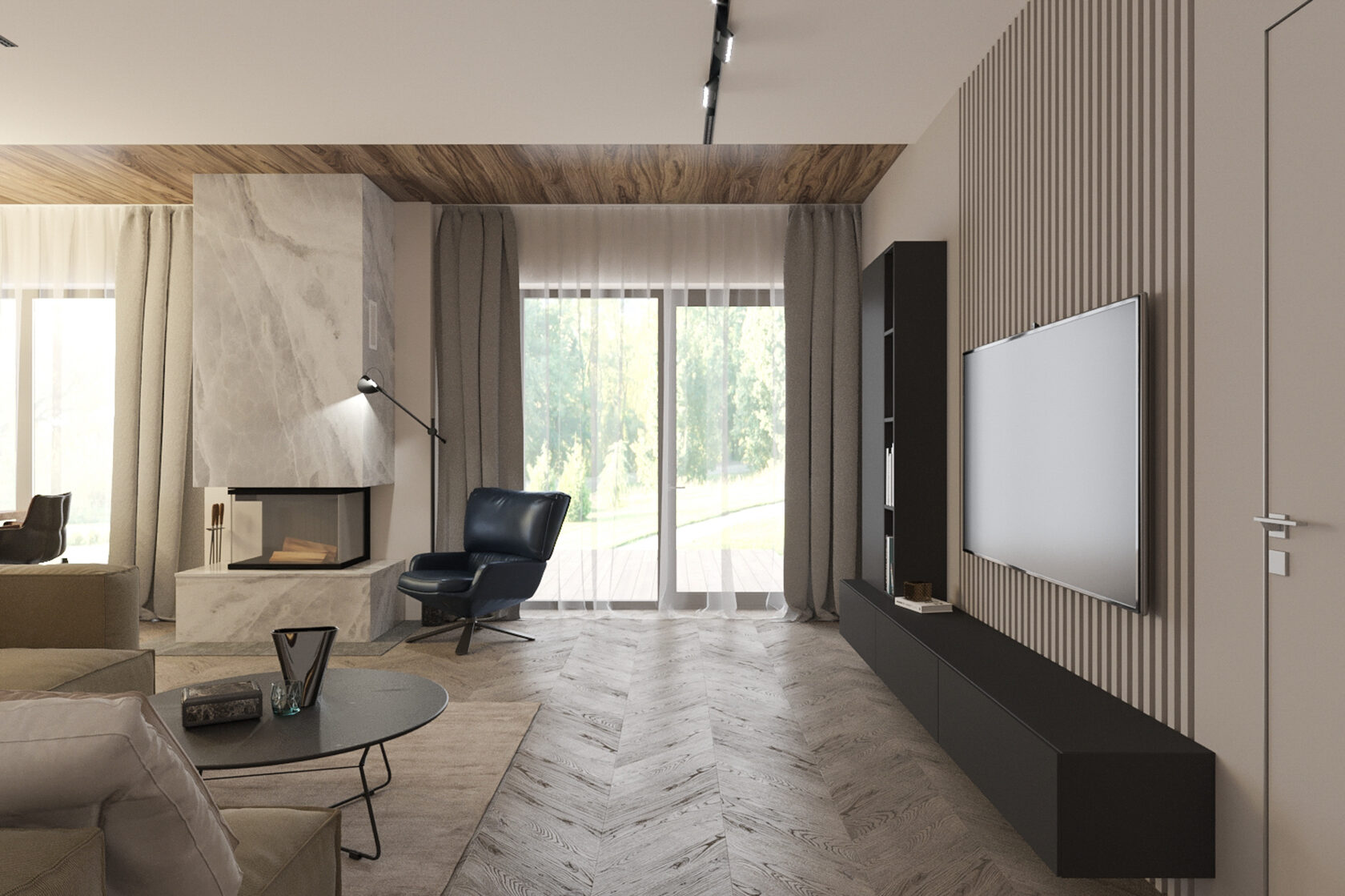 Мы разработали интерьер одноэтажного загородного дома для семьи, которая приезжает сюда на выходные и летом. Ключевой задачей было создать ощущение единения с природой, используя спокойную палитру и натуральные материалы — дерево и камень.