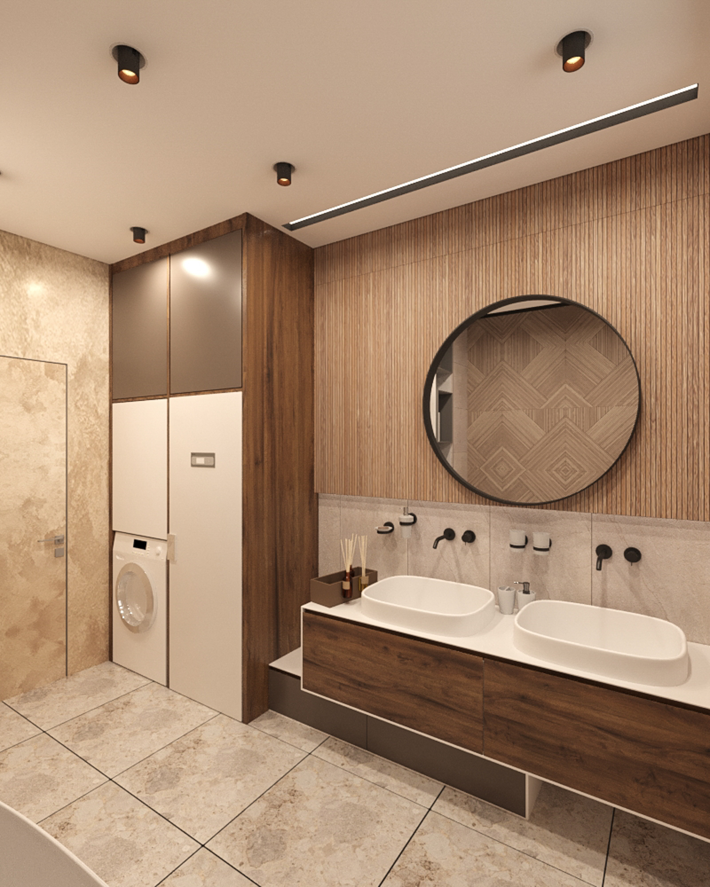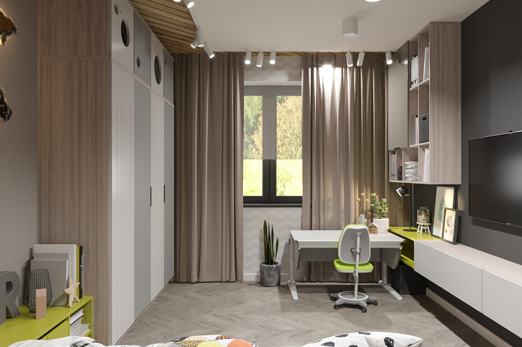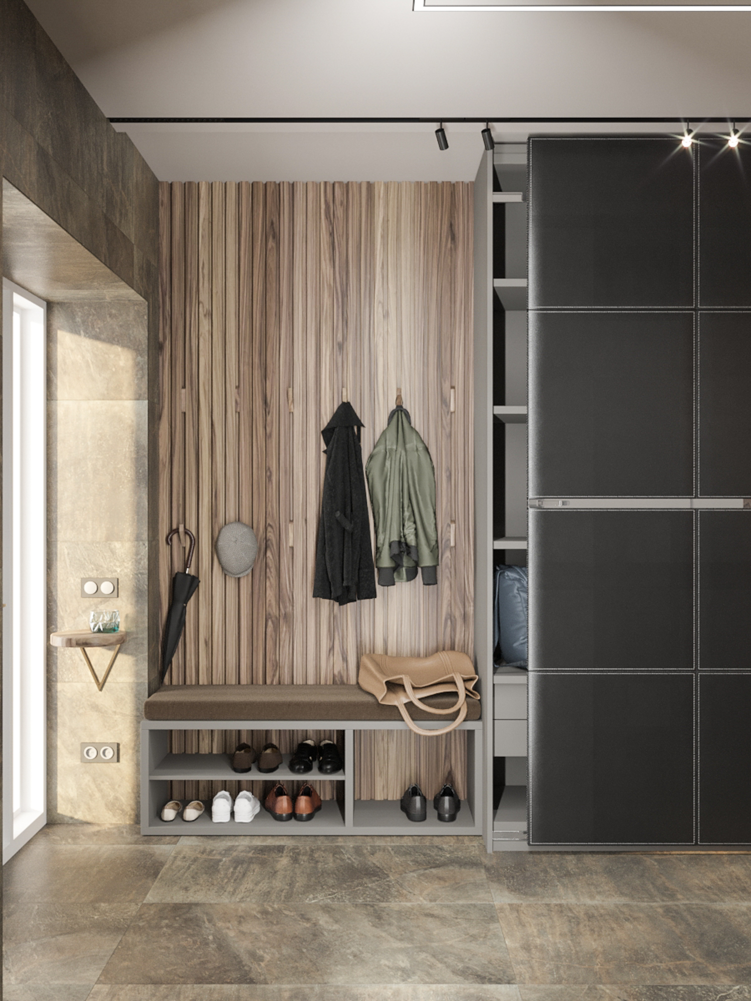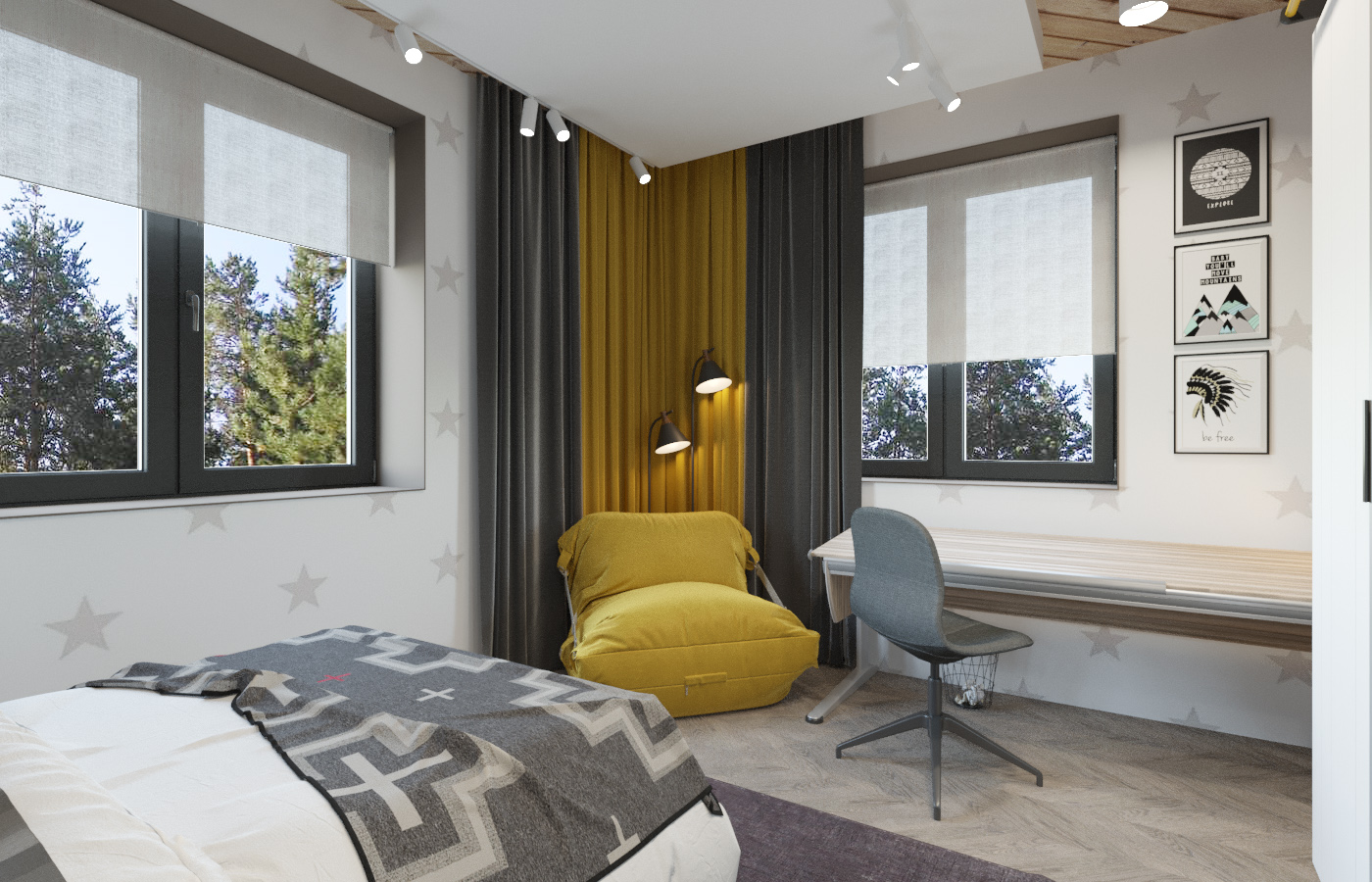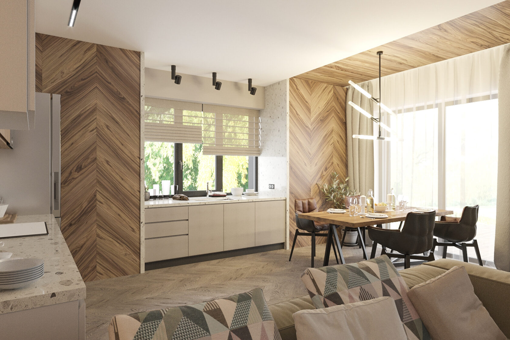 Мы разработали интерьер одноэтажного загородного дома для семьи, которая приезжает сюда на выходные и летом. Ключевой задачей было создать ощущение единения с природой, используя спокойную палитру и натуральные материалы — дерево и камень.