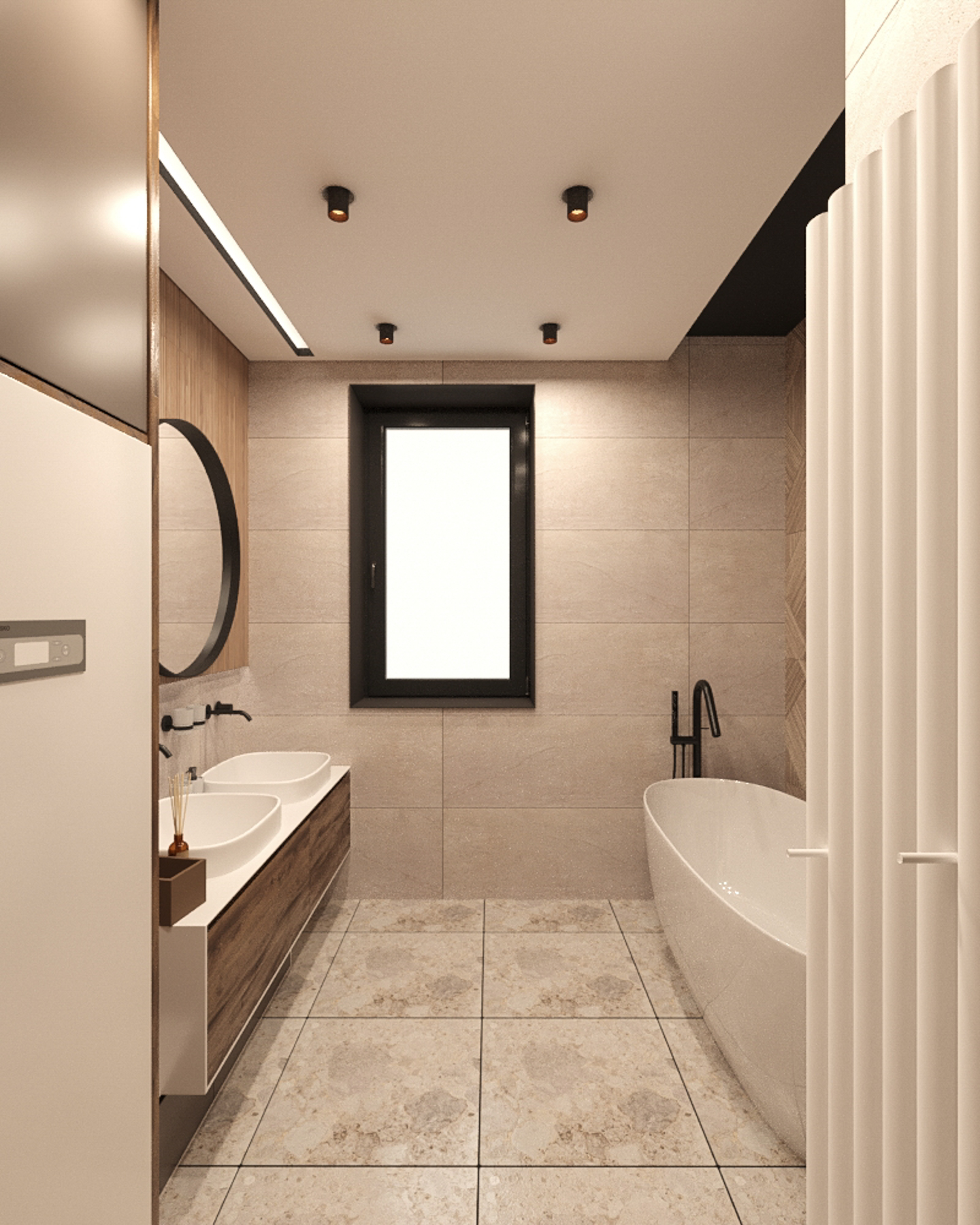 Центром дома стала объединенная гостиная с камином и панорамными окнами в пол. Эти окна открывают вид на луга и овраг, создавая эффект перетекания пространства и связывая интерьер с окружающим ландшафтом. В отделке мы сознательно использовали минимум материалов, чтобы ничего не отвлекало от созерцания природы и не нарушало атмосферу спокойного уединения.