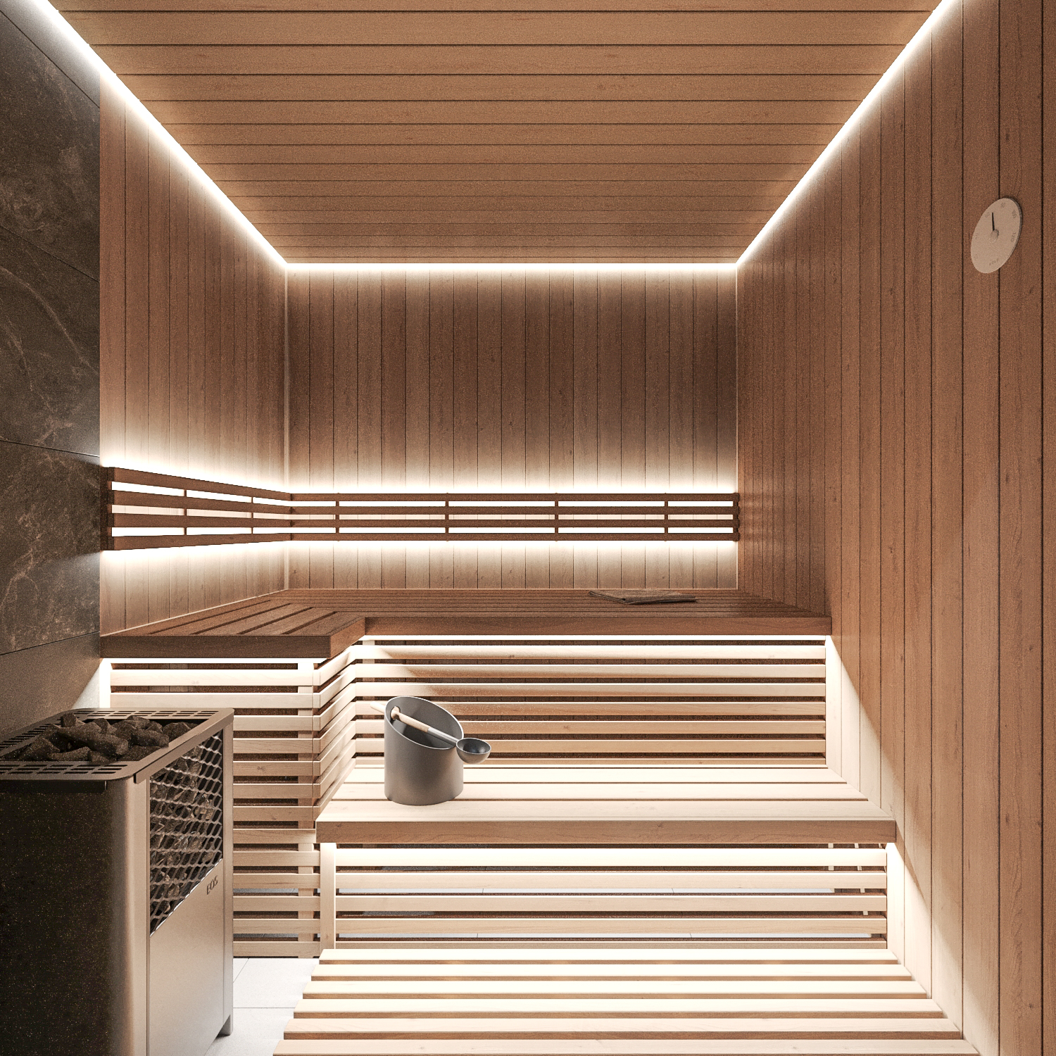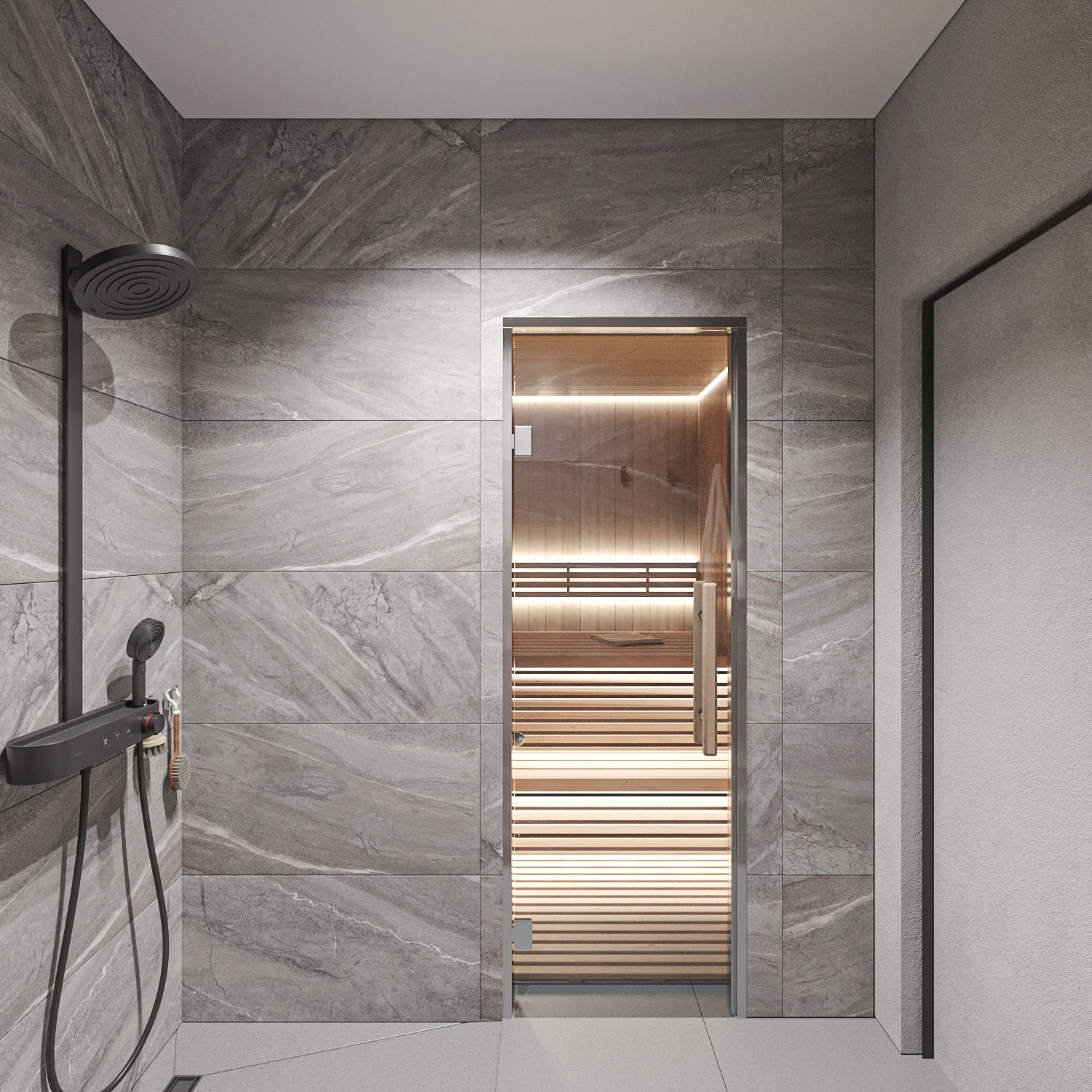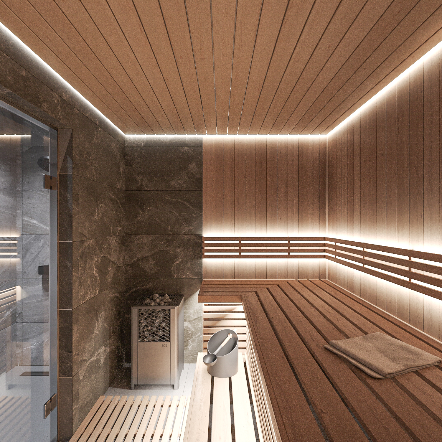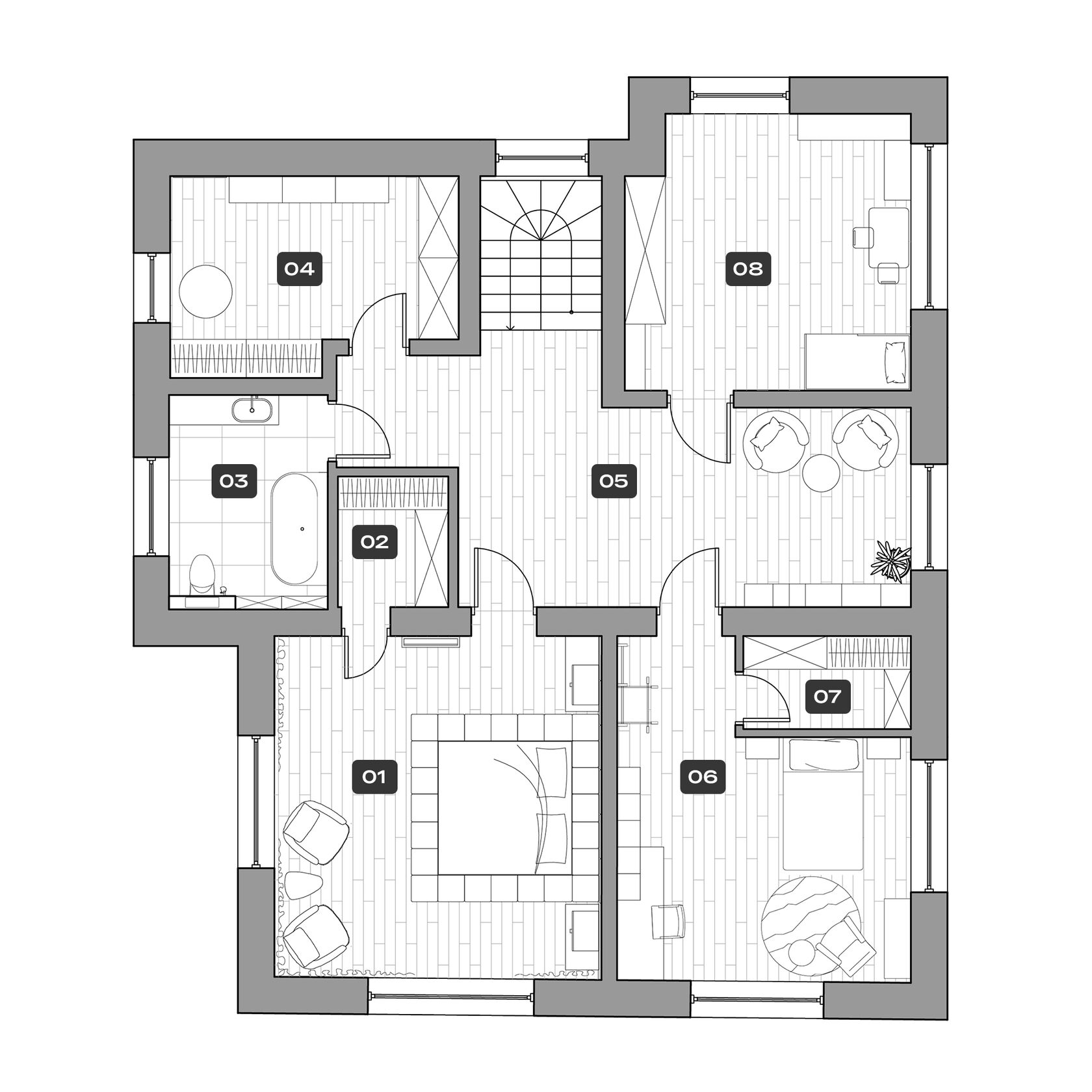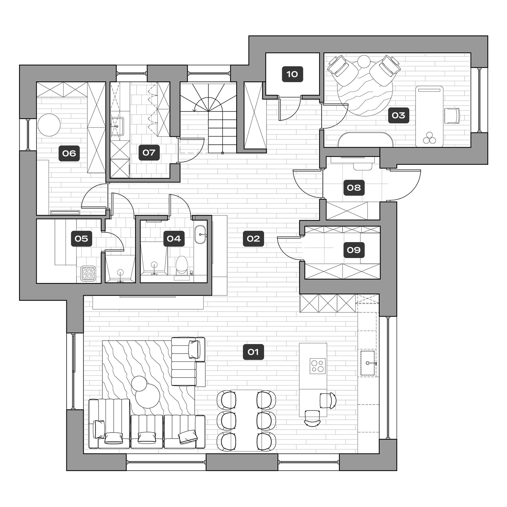 На первом этаже мы объединили кухню и гостиную в единое помещение, оформив его стеновыми панелями, шпоном и декоративной штукатуркой. Здесь же расположены кабинет, сауна с душевой и технические помещения. На втором этаже находится мастер-спальня и две детские комнаты. В отделке мы сознательно ограничились немногими материалами — бамбуком, деревом, краской, — чтобы добиться ощущения гармонии, спокойствия и тактильного комфорта.