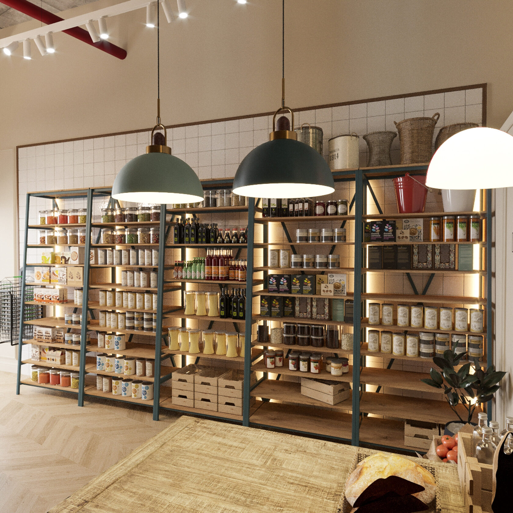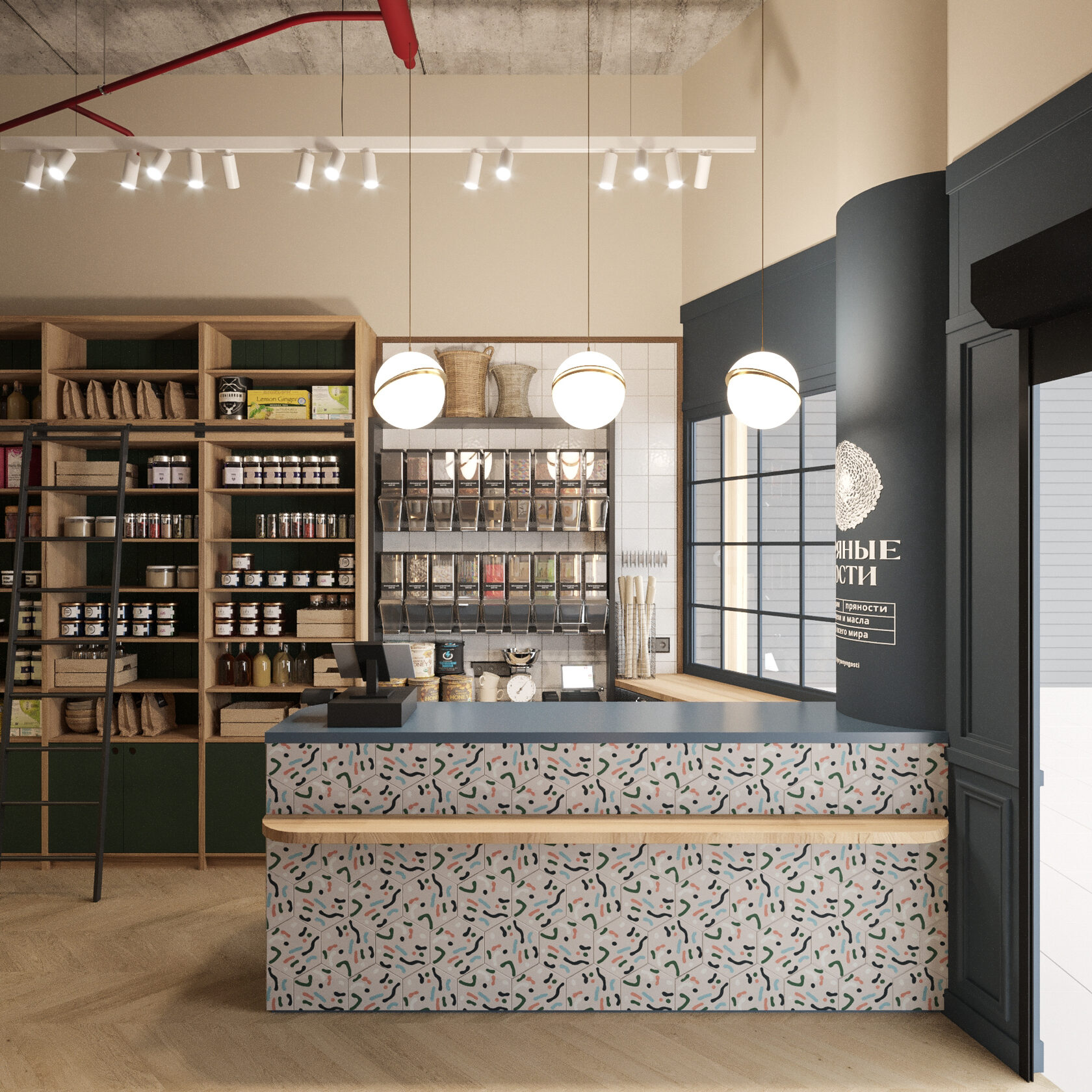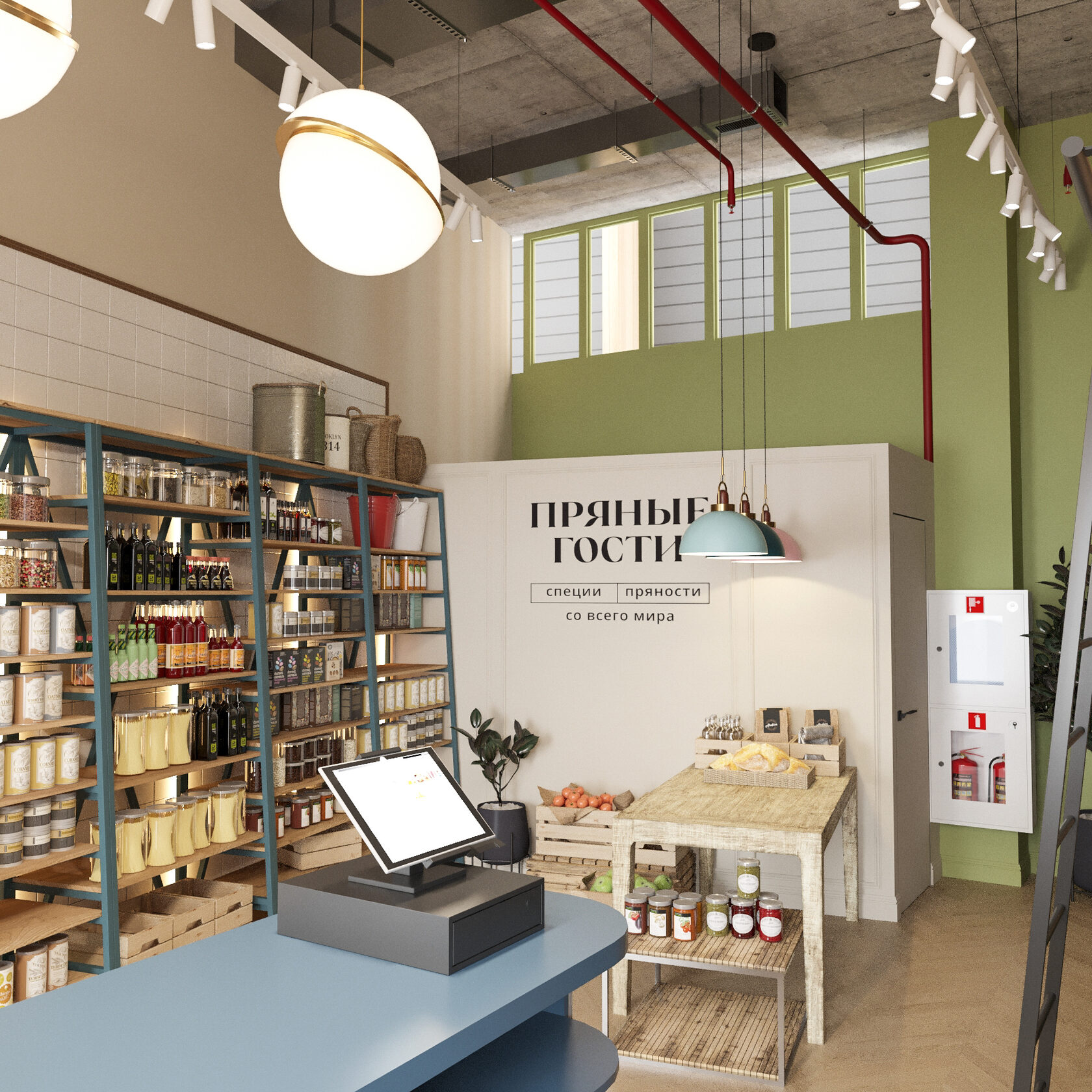 Мы создавали интерьер для магазина пряностей, которым владеют настоящие энтузиасты своего дела. Главной задачей было организовать очень много систем хранения, чтобы вместить обширную коллекцию специй, но при этом пространство не должно было напоминать склад.
