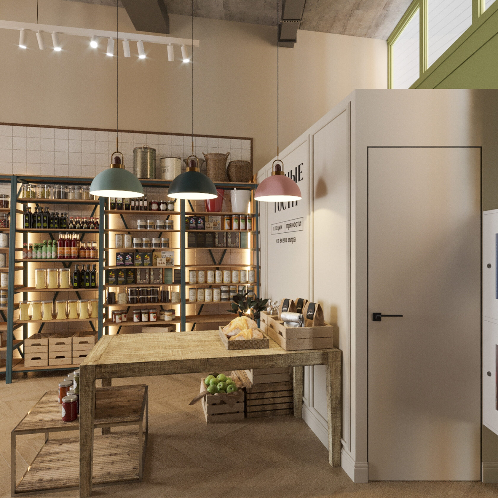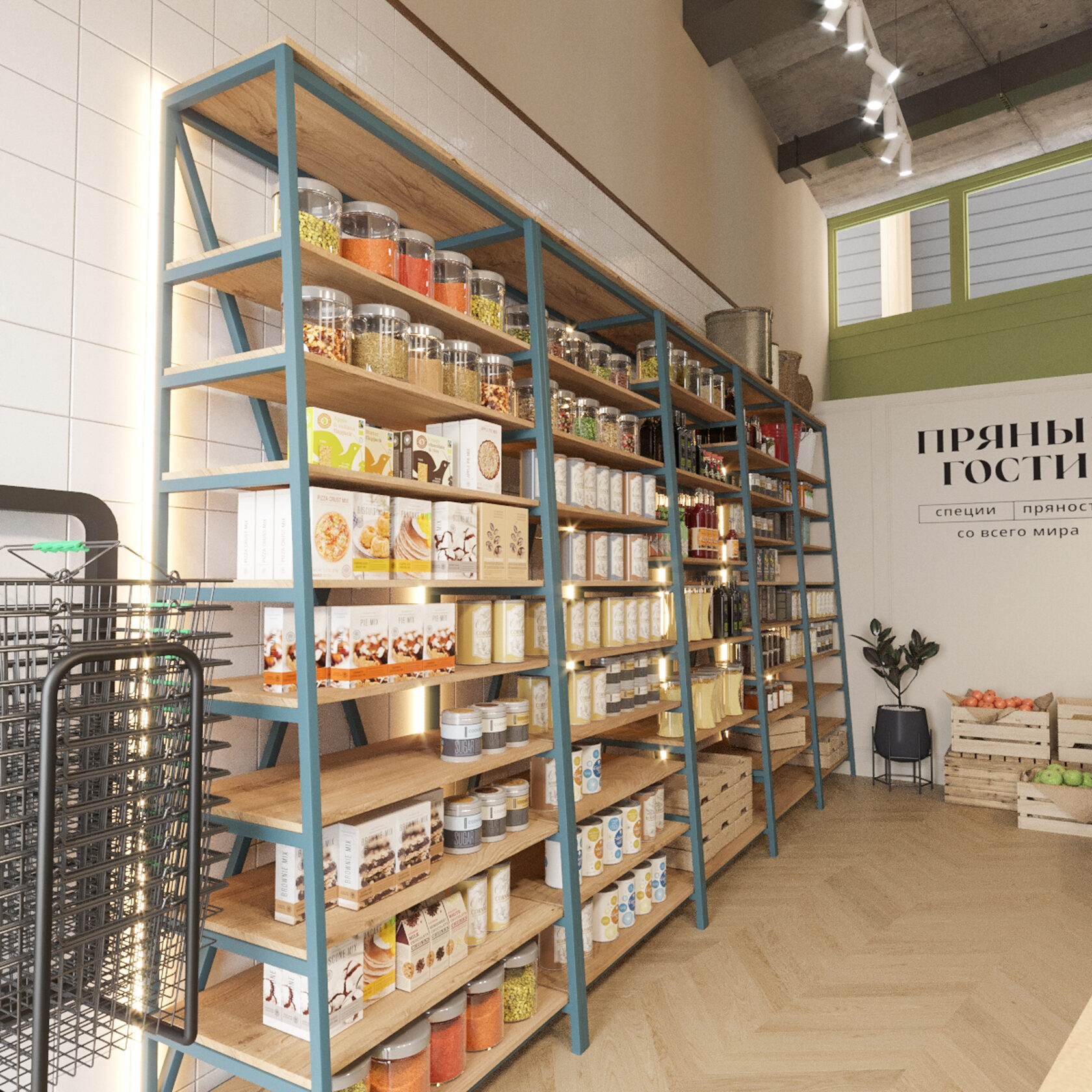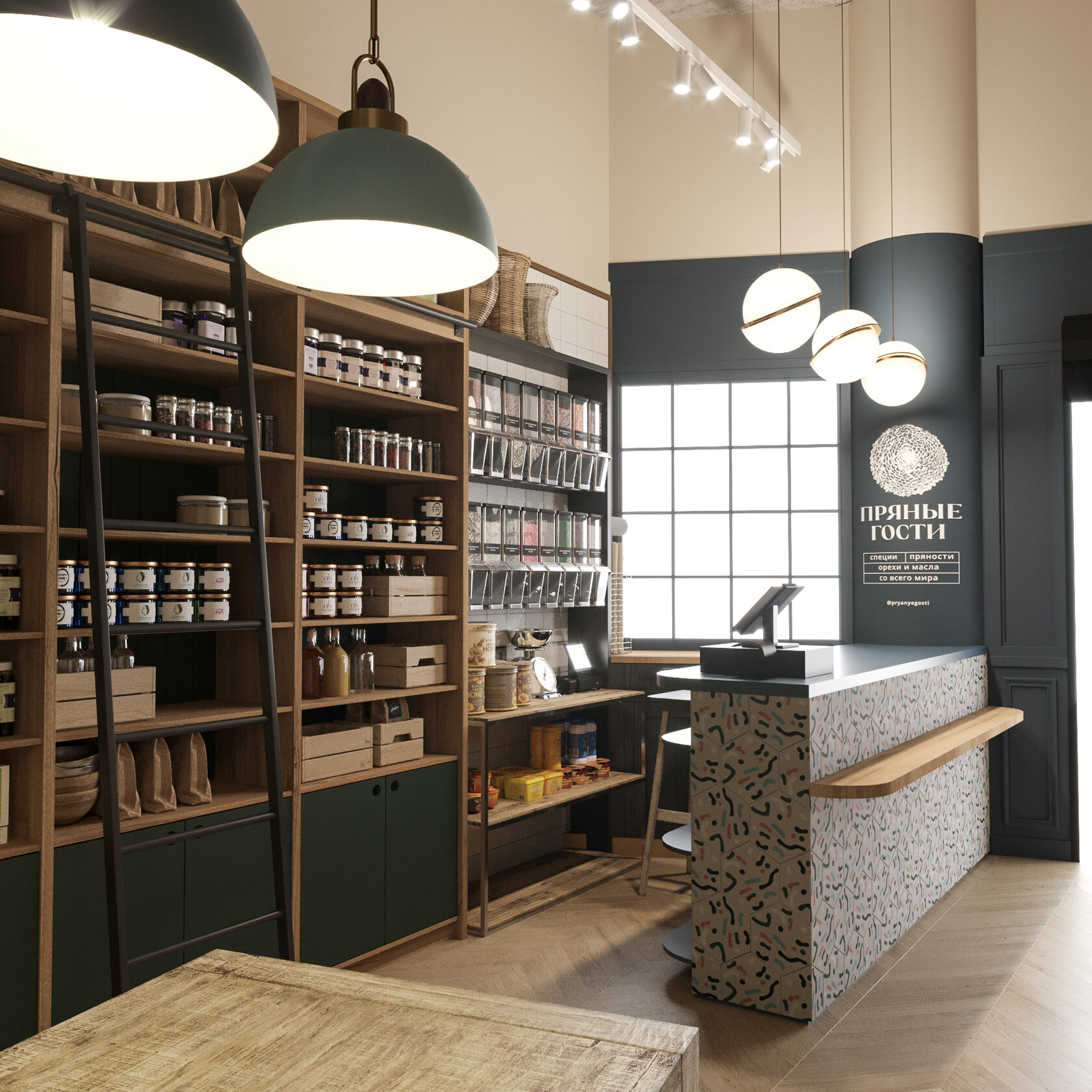 Мы сделали акцент на самом товаре. Специи в стеклянных банках стали главным украшением, а интерьер мы построили вокруг них, используя много дерева, спокойные природные тона и элементы стиля шебби-шик с легкой потертостью. Получился уютный крафтовый магазин, где каждая деталь подчеркивает уникальность продукта и создает ощущение аутентичности, привлекая покупателей в атмосферное пространство, полностью посвященное специям.