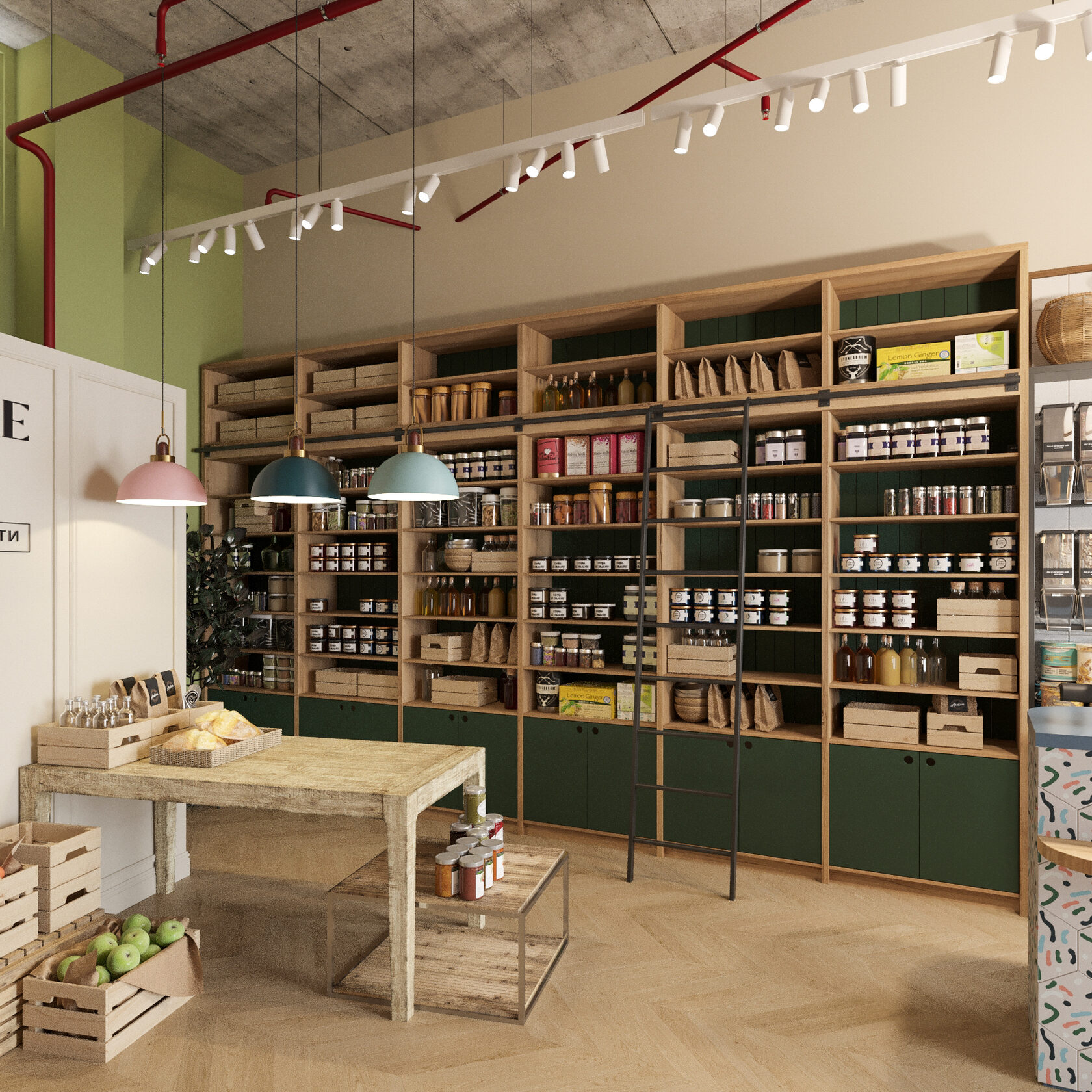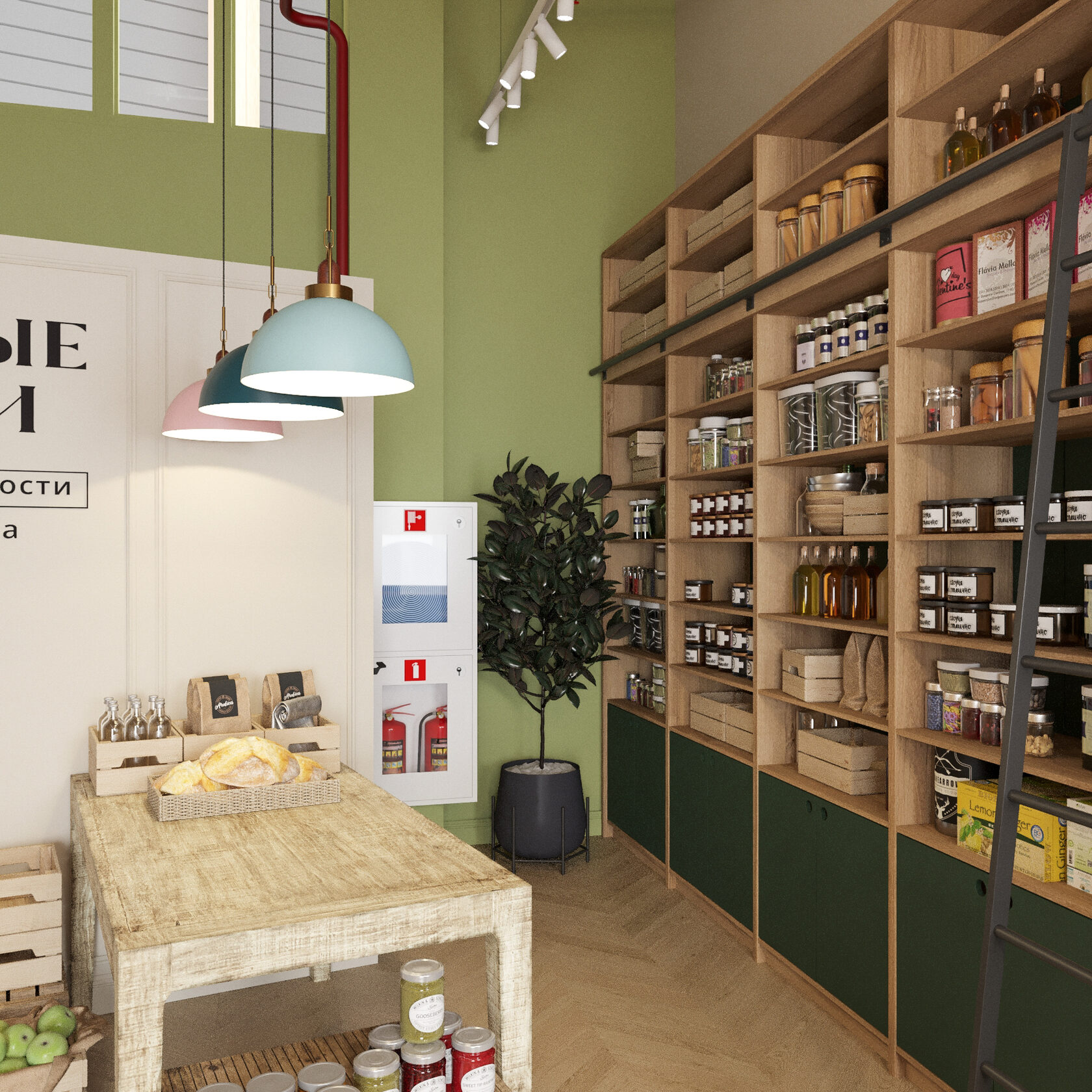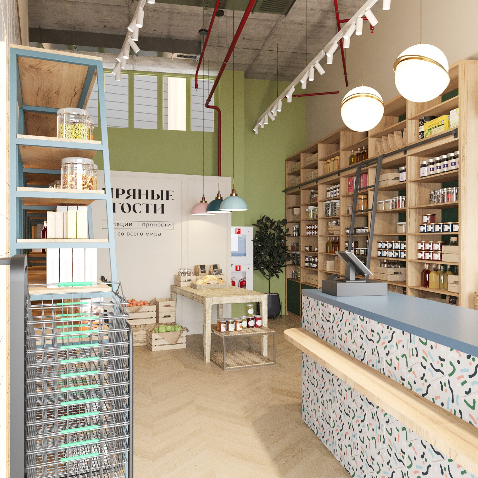 Мы сделали акцент на самом товаре. Специи в стеклянных банках стали главным украшением, а интерьер мы построили вокруг них, используя много дерева, спокойные природные тона и элементы стиля шебби-шик с легкой потертостью. Получился уютный крафтовый магазин, где каждая деталь подчеркивает уникальность продукта и создает ощущение аутентичности, привлекая покупателей в атмосферное пространство, полностью посвященное специям.